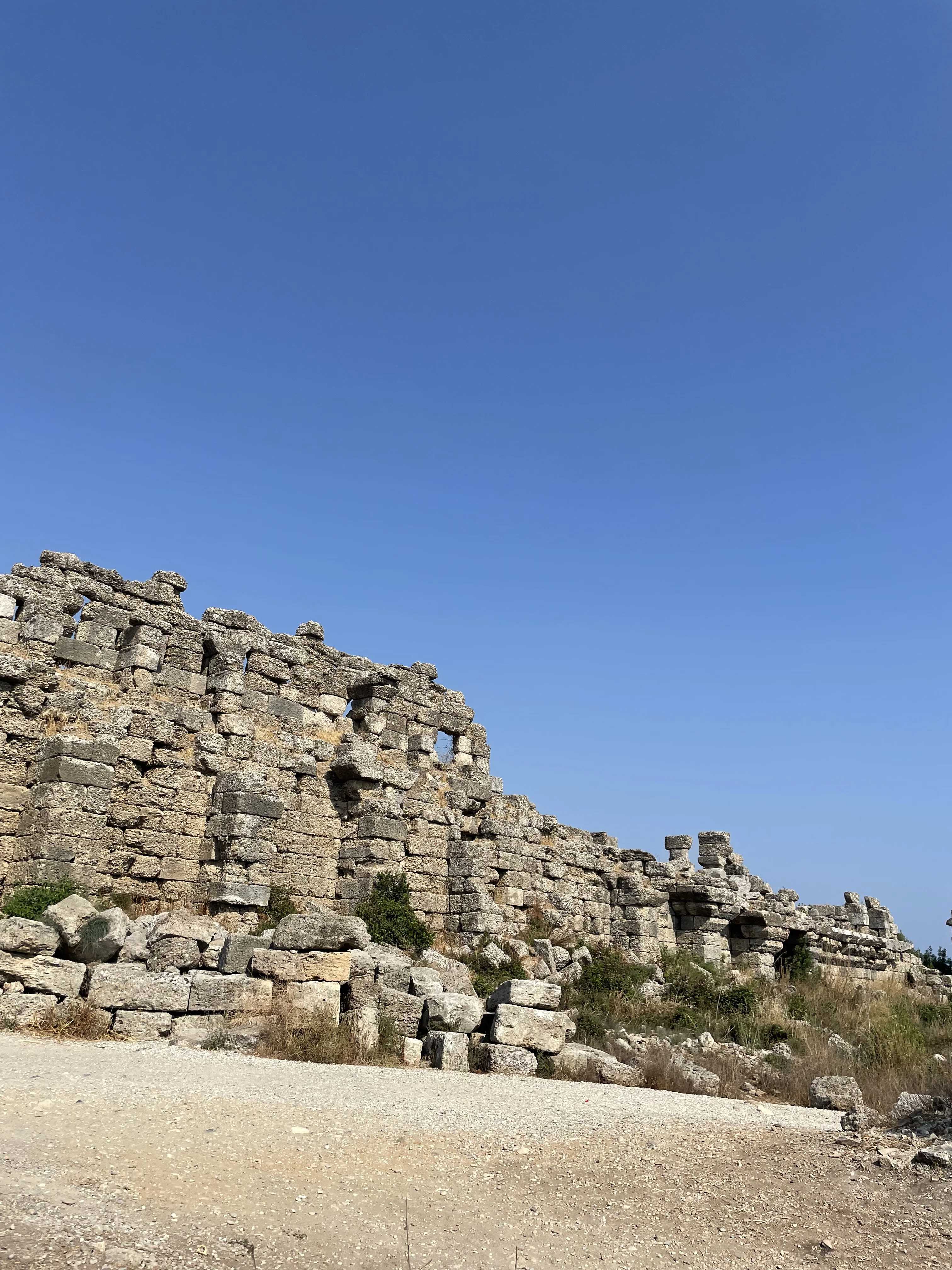 Величественные остатки античной фортификации, чьи массивные стены из грубого камня хранят многовековую историю. Фактурная кладка, опаленная солнцем, и россыпь камней у подножия создают атмосферу прикосновения к вечности и монументальному прошлому.