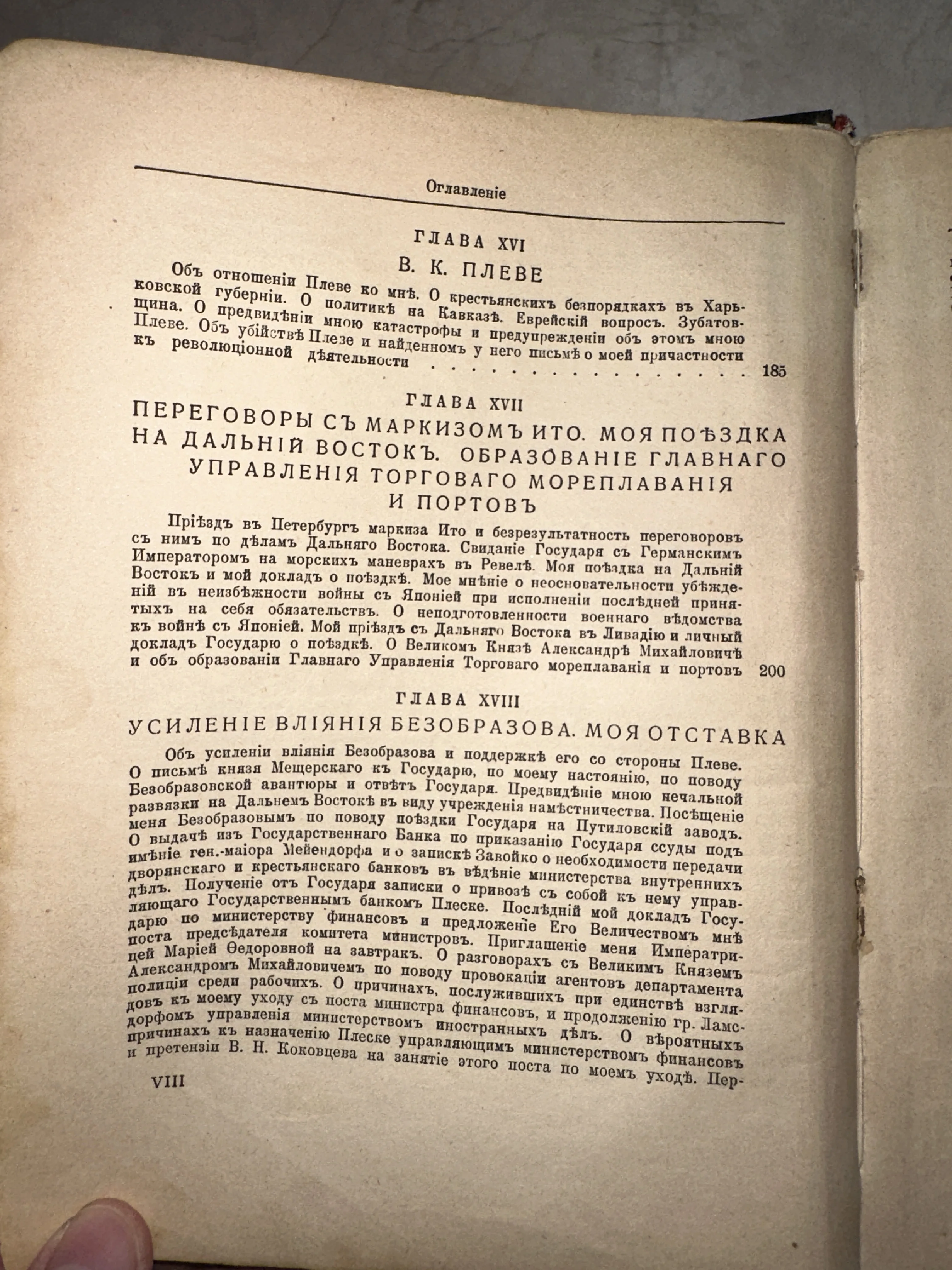 Уникальный фрагмент исторической памяти, запечатлевший оглавление мемуаров о ключевых событиях начала XX века, включая политику на Кавказе и переговоры на Дальнем Востоке. Пожелтевшая от времени бумага и характерная орфография с «ятями» передают подлинный дух ушедшей эпохи Российской империи. Текст в отличном состоянии, представляя высокую ценность для исследователей истории и коллекционеров редких книг.