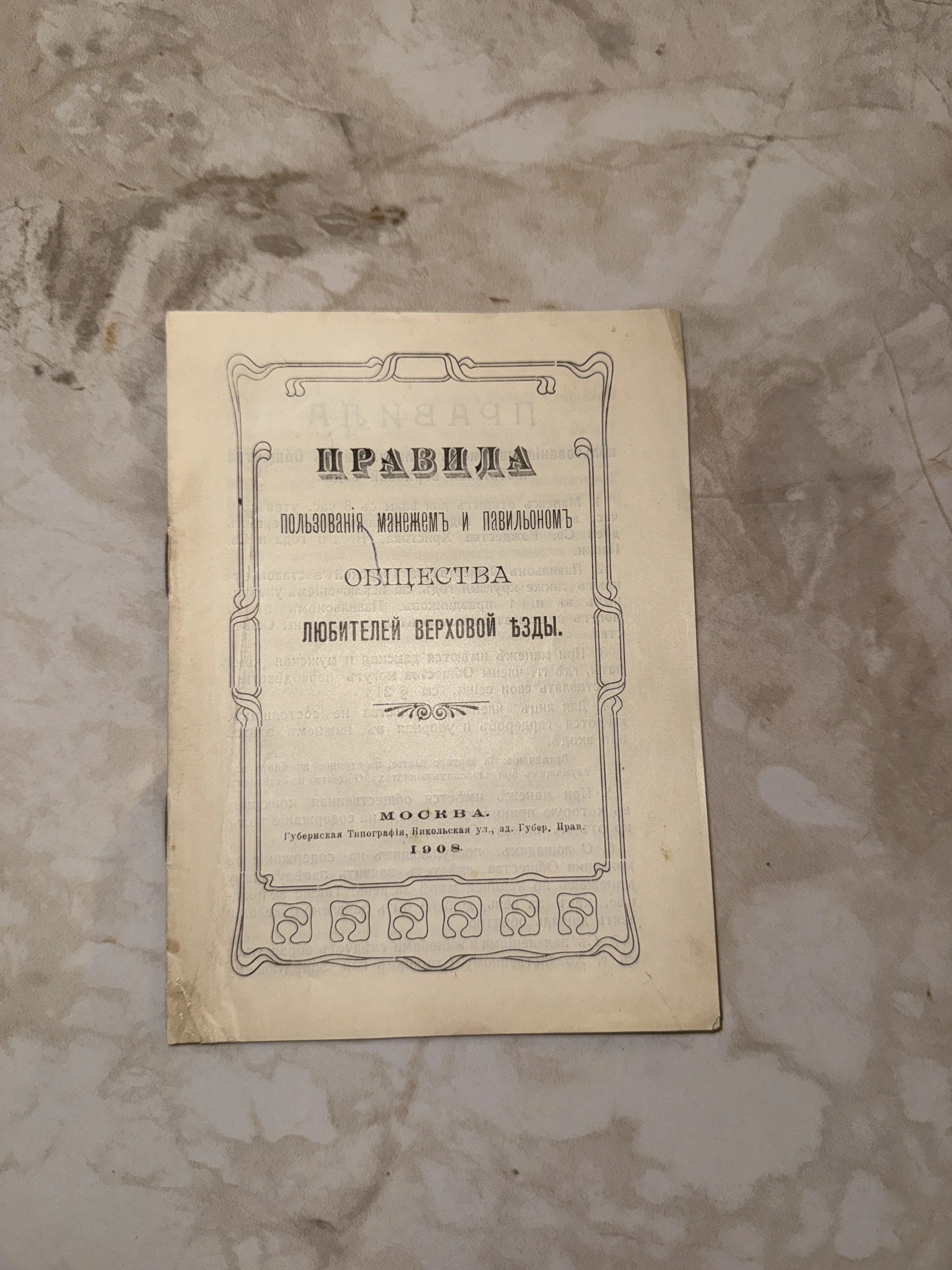 Уникальное свидетельство спортивной и светской жизни дореволюционной Москвы — оригинальный свод правил элитарного клуба верховой езды. Издание, отпечатанное в легендарной Губернской типографии на Никольской улице, оформлено в изящной эстетике начала XX века с характерными виньетками. Документ сохранил аутентичную патину времени, представляя огромный интерес для коллекционеров и историков московского быта.