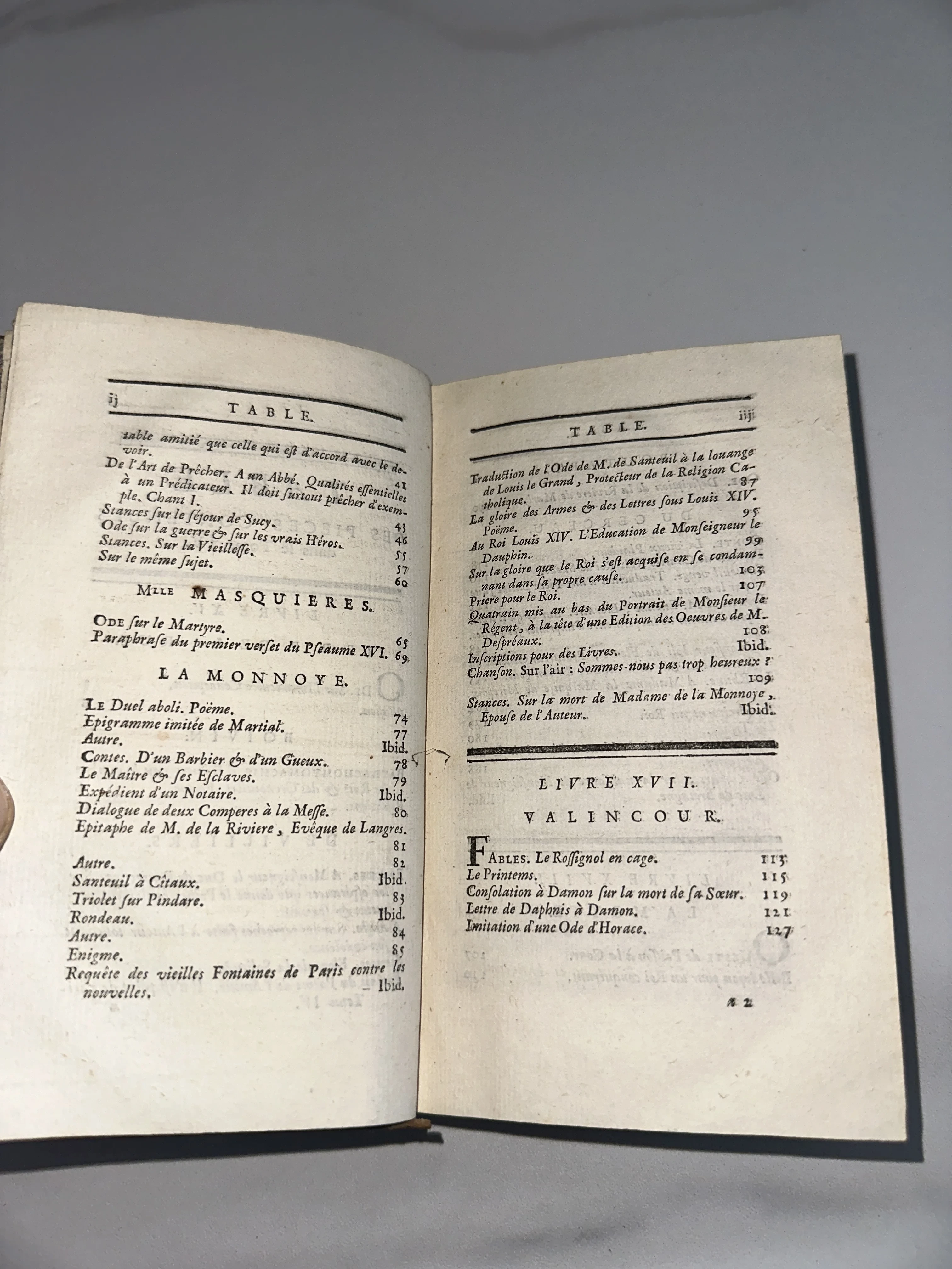 Разворот открытой антикварной книги на французском языке со страницей оглавления и текстом.