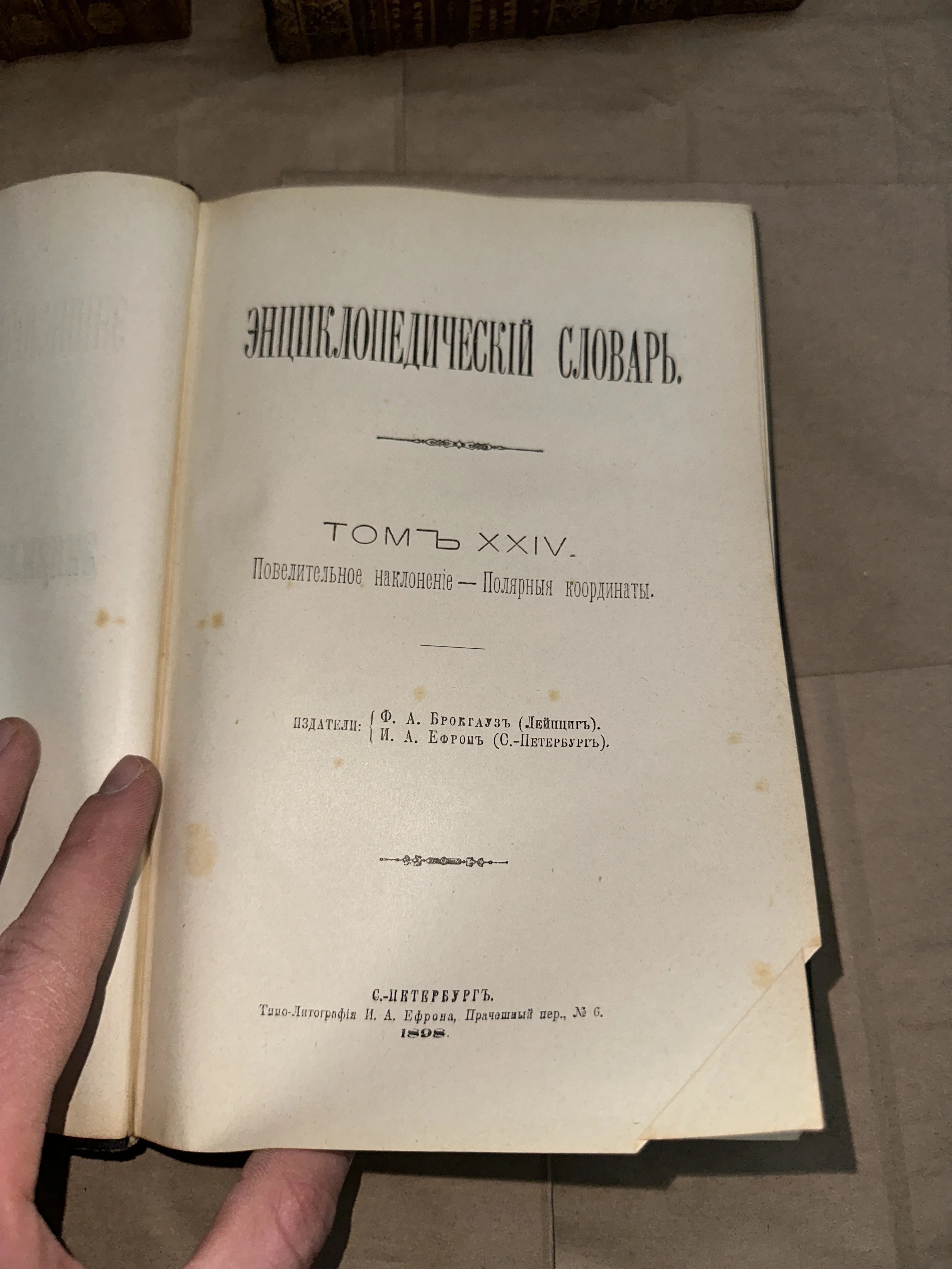 Перед вами титульный лист одного из самых известных фундаментальных изданий Российской империи — легендарного словаря Брокгауза и Ефрона. Страница сохранила благородную патину времени с легким лисьим крапом, что подчеркивает аутентичность и почтенный возраст тома. Четкая дореволюционная типографика и оригинальное оформление 1898 года делают этот экземпляр ценным объектом для коллекционеров букинистики.