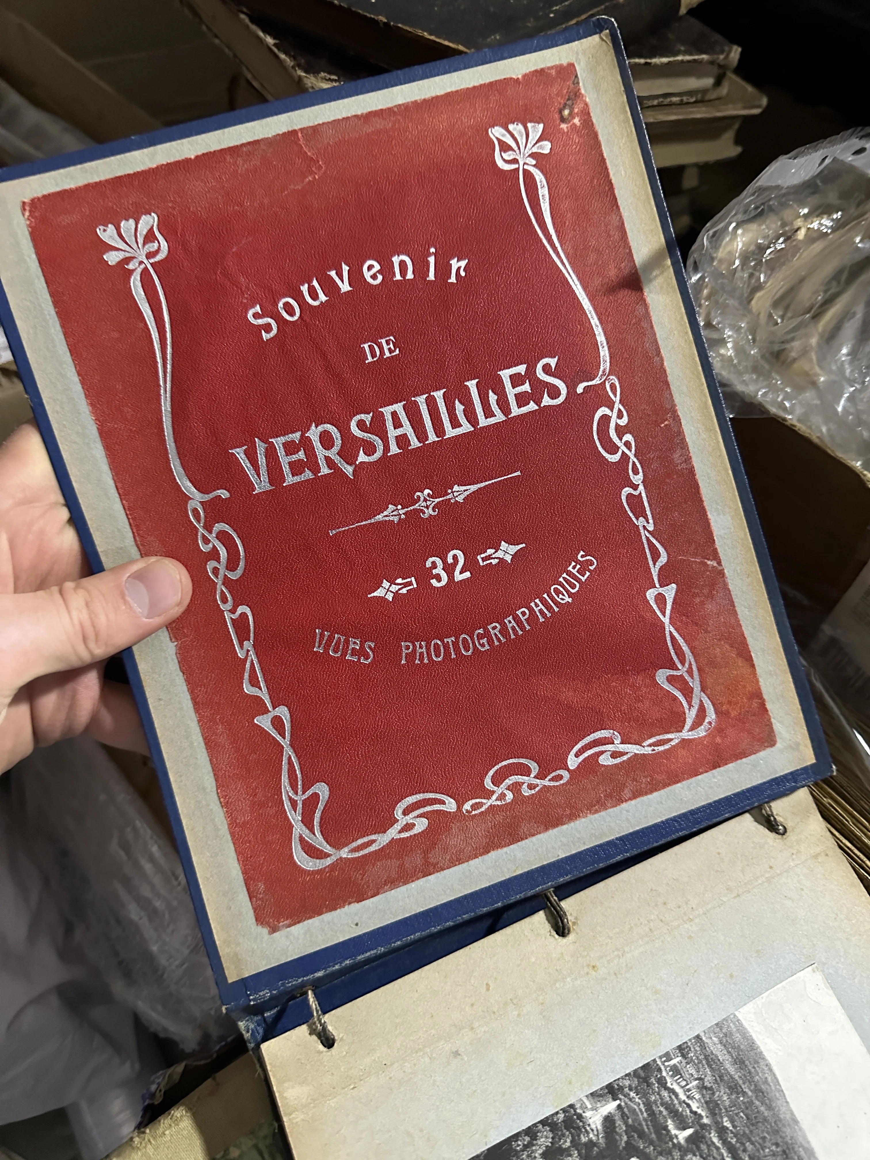 Красная обложка старинного альбома Souvenir de Versailles с серебряным тиснением в стиле модерн.