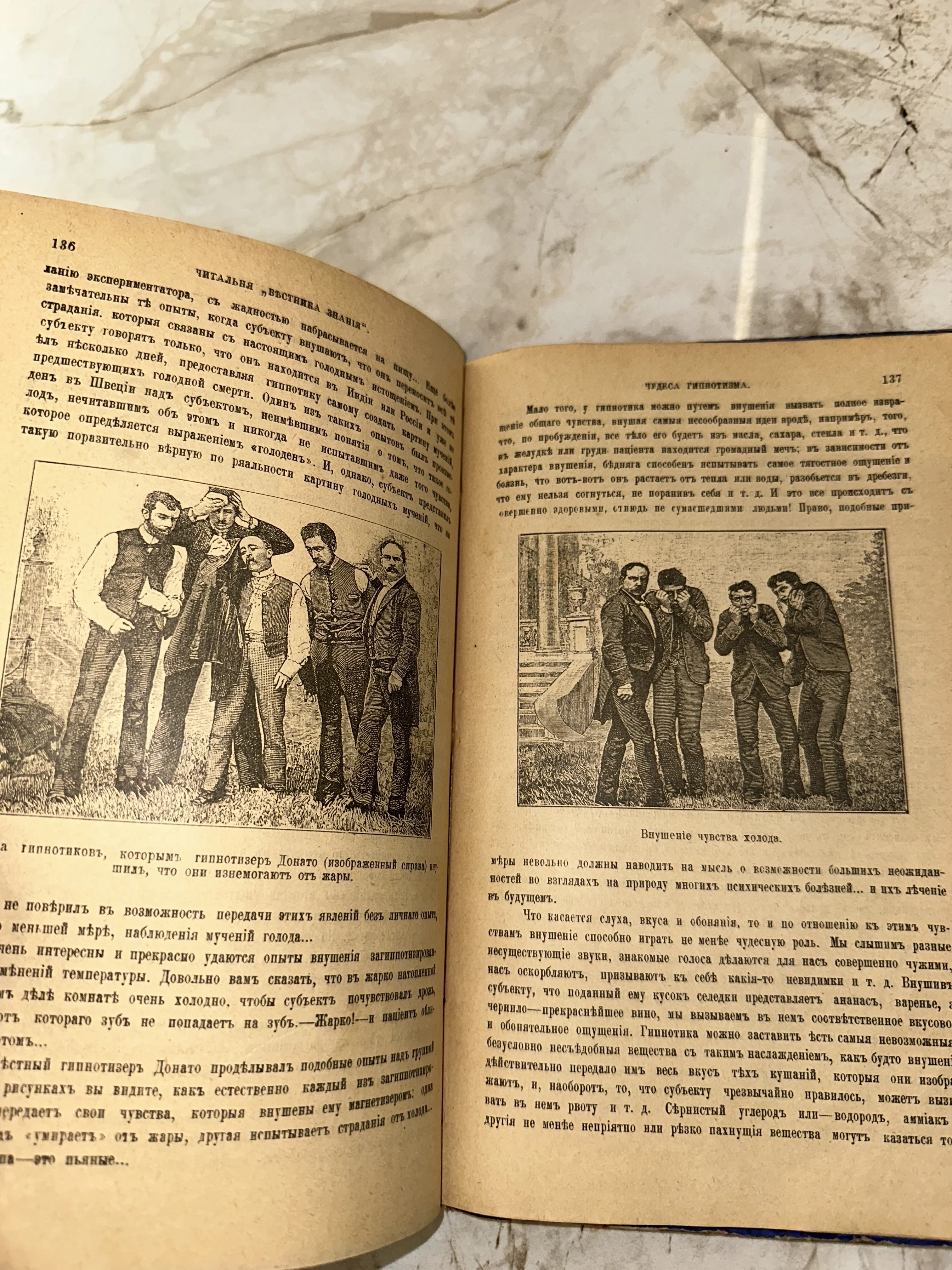Разворот старинной книги с дореволюционным шрифтом и гравюрами, изображающими людей во время сеанса гипноза.