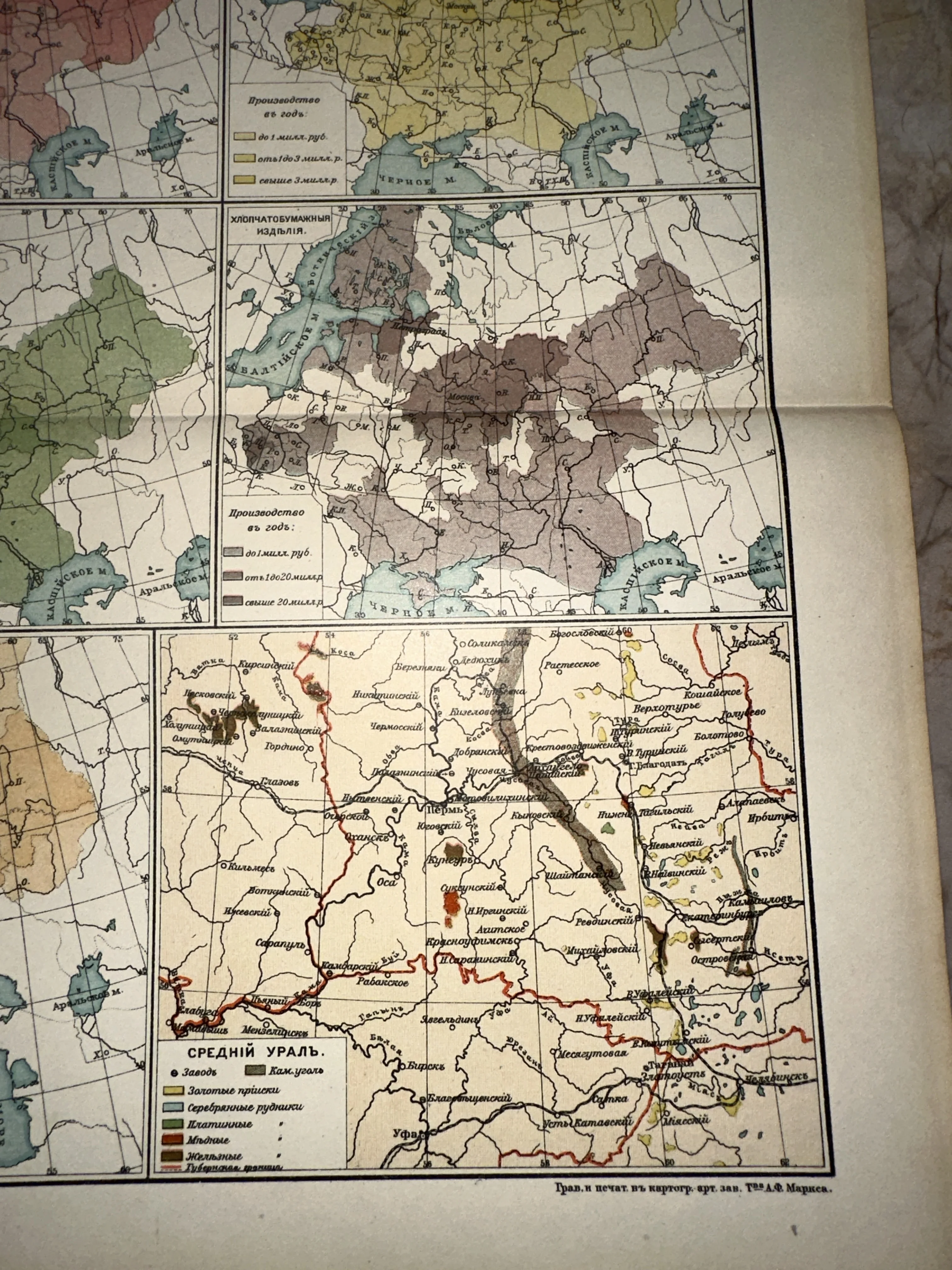 Редкий лист из дореволюционного атласа издательства А. Ф. Маркса, представляющий собой уникальный документ эпохи промышленного расцвета. Карта включает детальный план Среднего Урала с обозначением заводов и приисков, а также красочные статистические диаграммы производства. Сохранность бумаги с характерной патиной времени подчеркивает подлинность и антикварную ценность этого экземпляра.