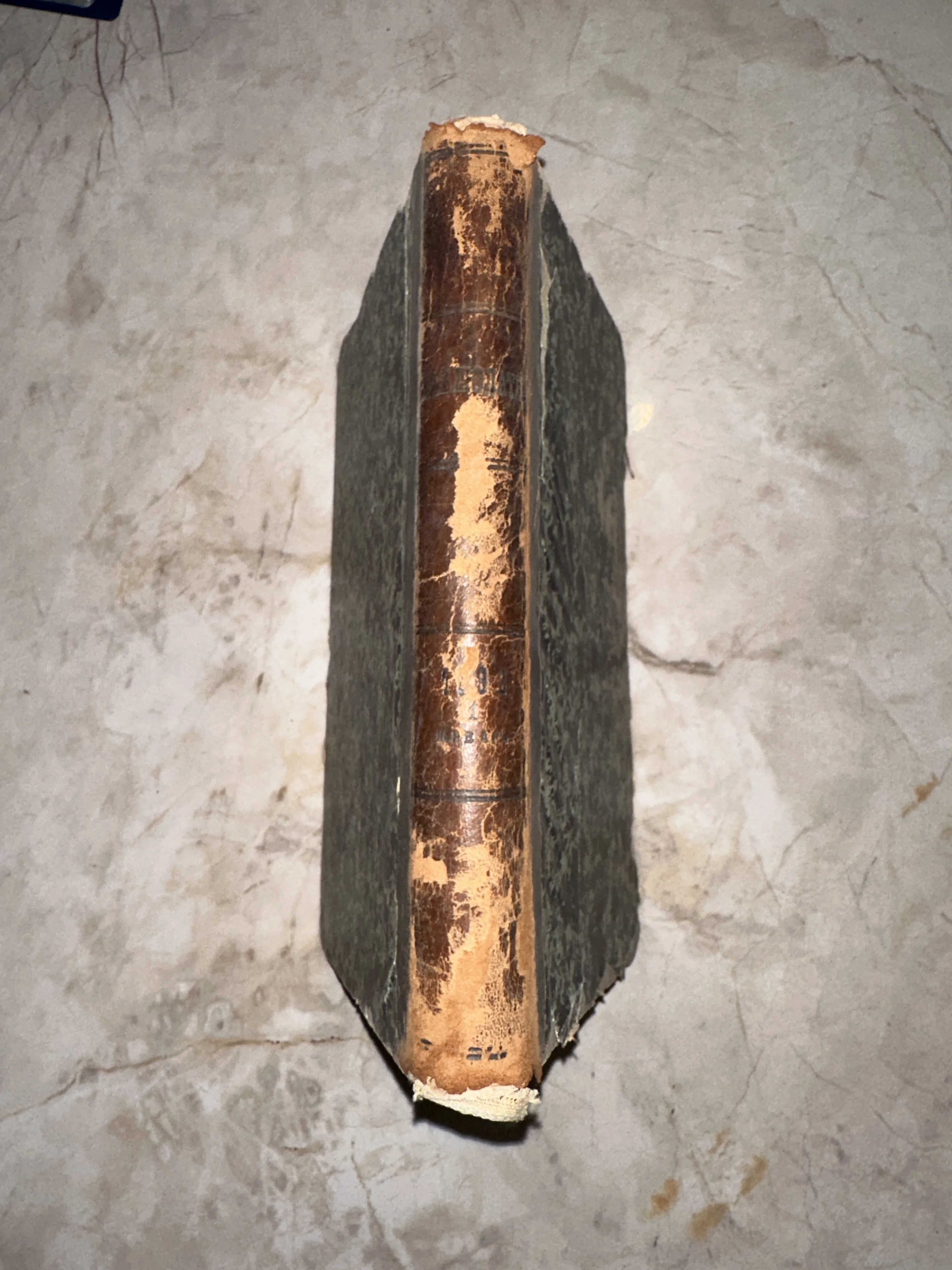Корешок старинной книги в потертом кожаном переплете на фоне мраморной поверхности.