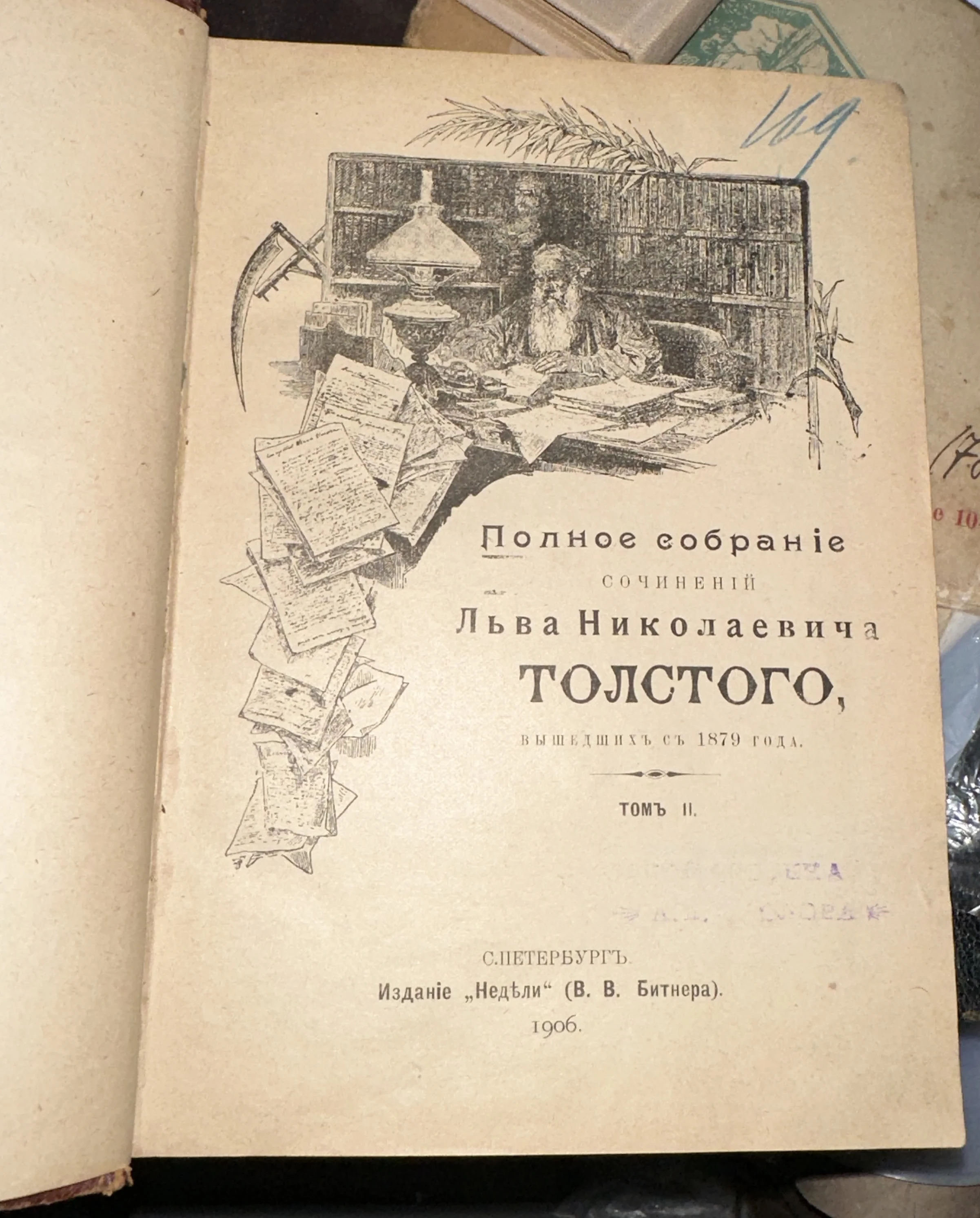 Изящный титульный лист из прижизненного типа изданий, выпущенный в 1906 году типографией В. В. Битнера. Особую ценность представляет детальная гравюра, объединяющая образ работающего философа с символами его связи с народом — крестьянской косой и колосьями. Страница сохранила благородный кремовый оттенок старины и станет жемчужиной в коллекции любителей русской классики.