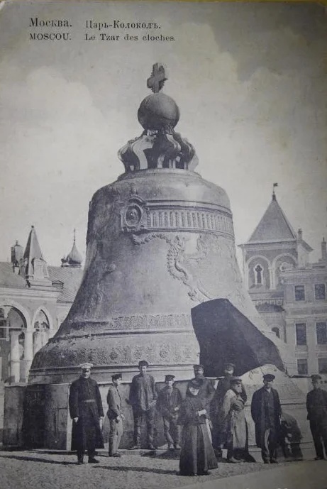 Эта редкая дореволюционная открытка запечатлела монументальность знаменитого памятника и живую историю Москвы. Фигуры людей в характерных для того времени одеждах позволяют наглядно оценить колоссальные масштабы Царь-колокола, а классическая типографика с двойным названием подчеркивает антикварный шарм предмета.