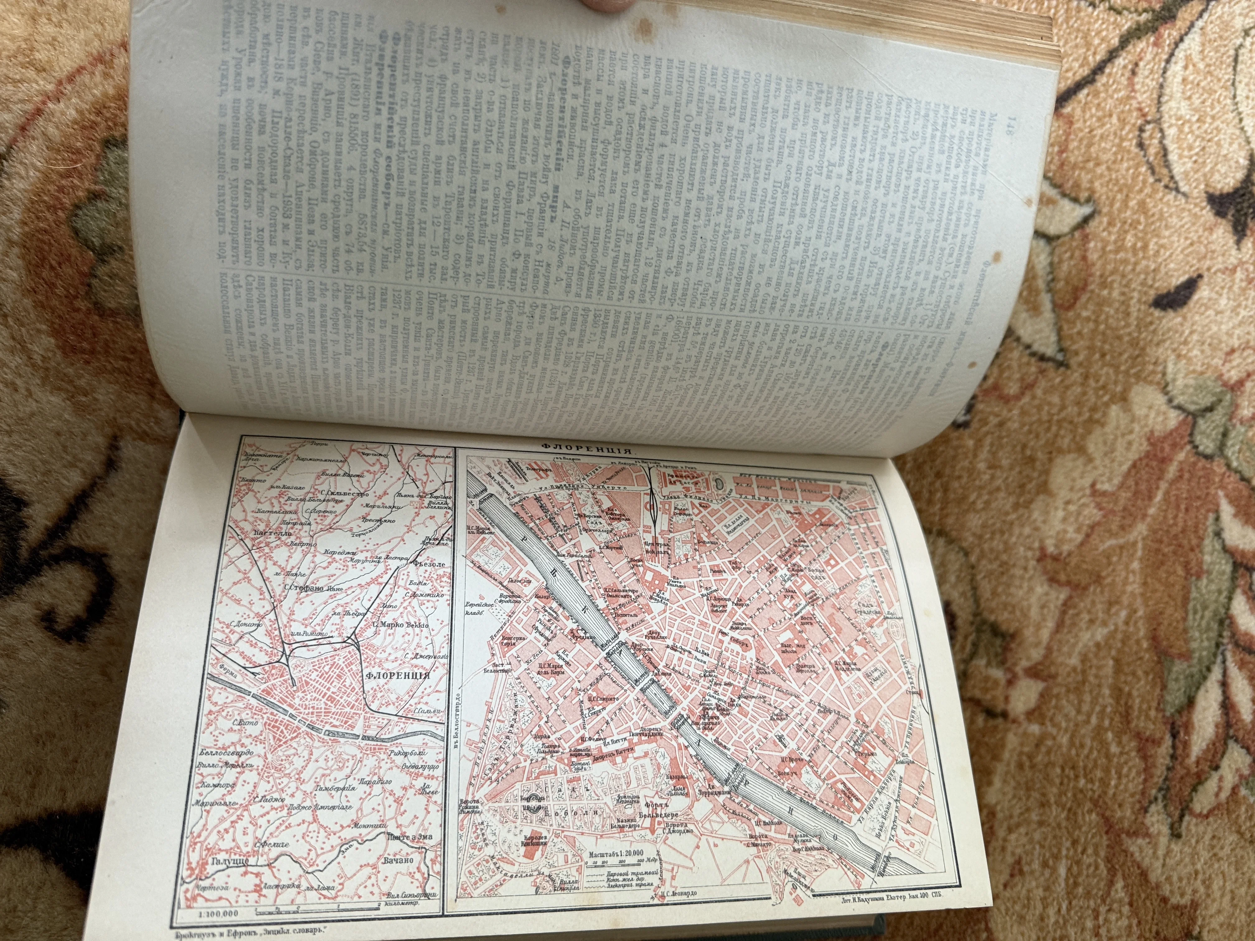 Великолепно сохранившийся экземпляр карты Флоренции из легендарного энциклопедического словаря Брокгауза и Ефрона. Детальная литография с изображением городских кварталов, мостов и течения реки Арно передает дух картографии конца XIX века. Бумага с легким благородным налетом времени придает этому развороту особую коллекционную ценность.