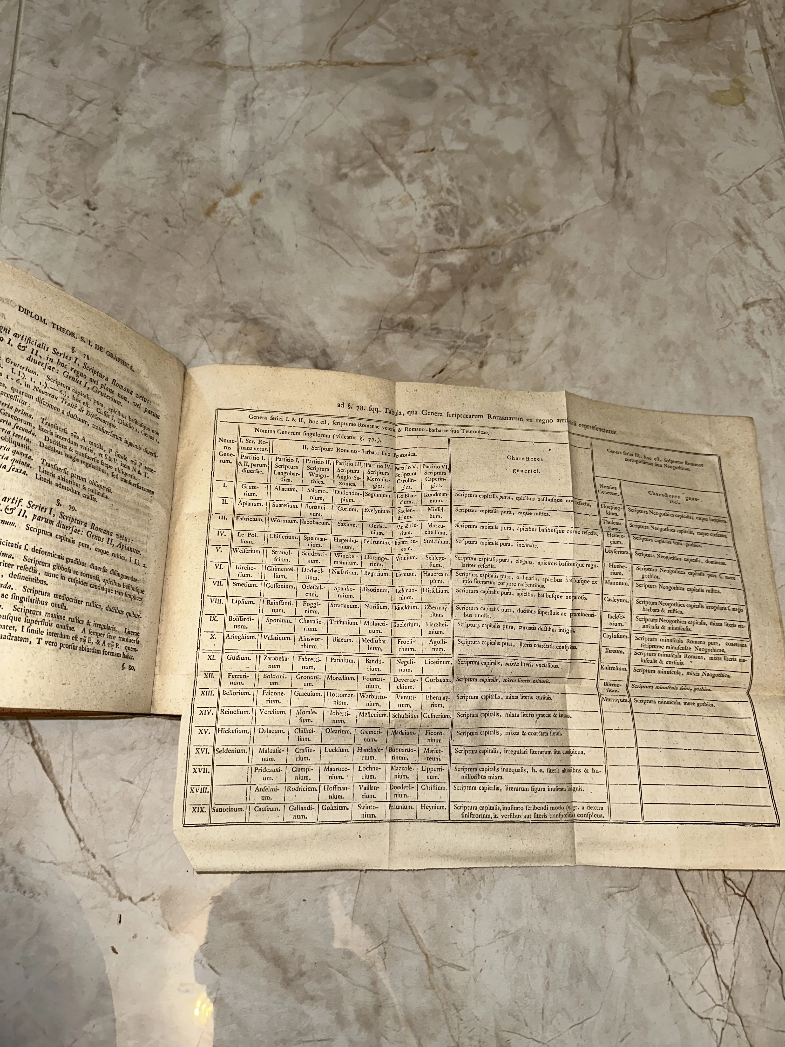 Редкий образец научного труда XVIII-XIX века, посвященный изучению древней графики и палеографии. Тщательно детализированная складная таблица на пожелтевшей бумаге систематизирует различные типы античных и средневековых шрифтов, сохраняя дух академической точности прошлого. Идеальный предмет для оформления кабинета или коллекции любителя истории книгопечатания.