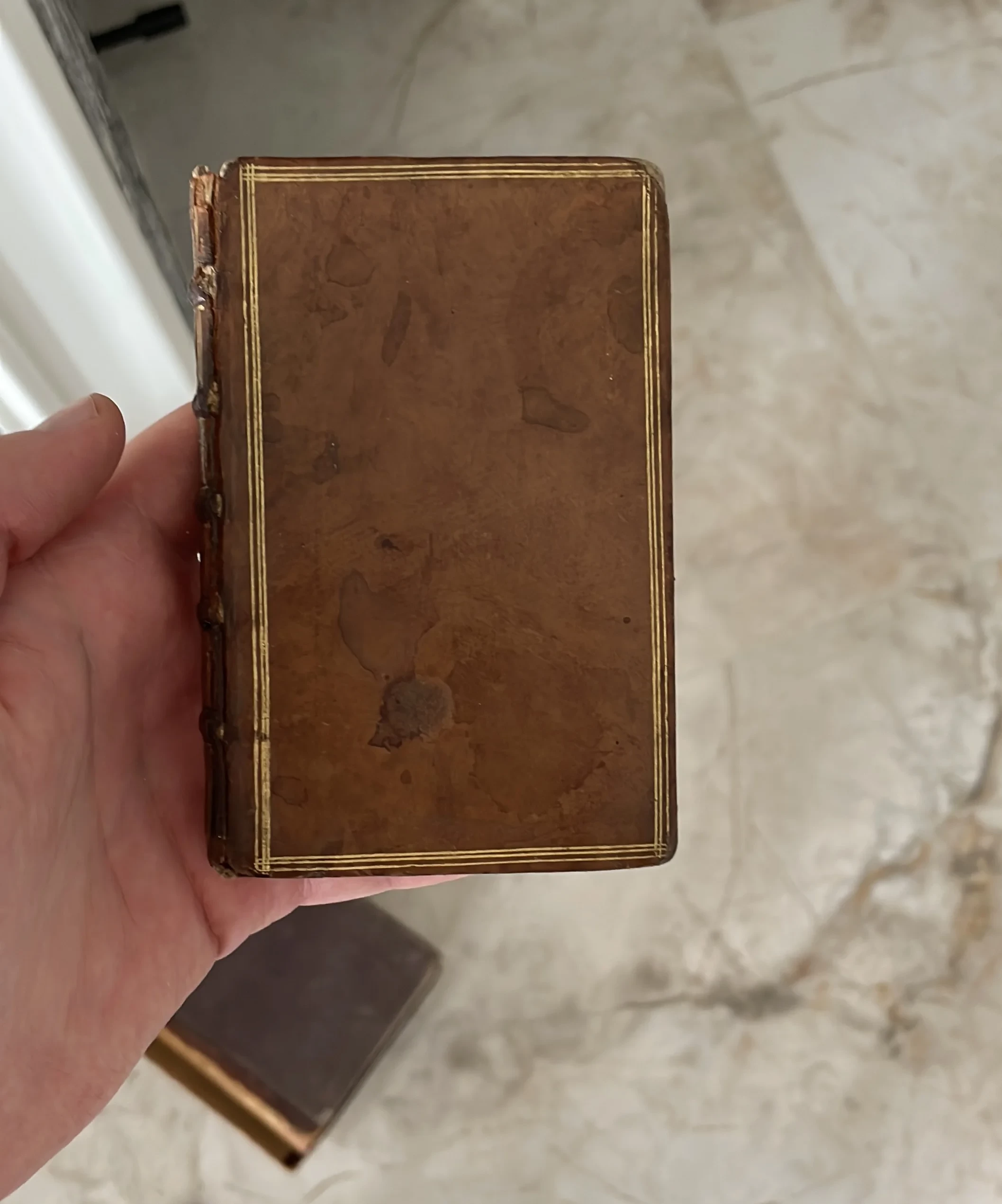 Малоформатная антикварная книга в коричневом кожаном переплете с золотой рамкой и бинтовым корешком.