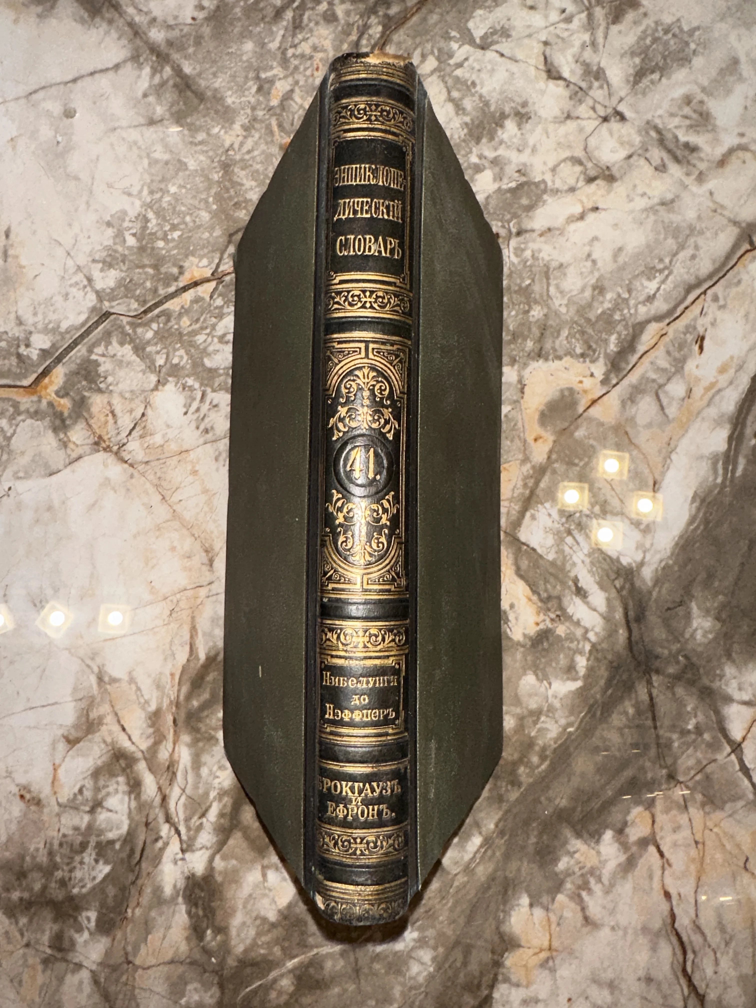 Антикварный том энциклопедического словаря Брокгауза и Ефрона, вид на корешок с золотым тиснением на мраморном фоне.