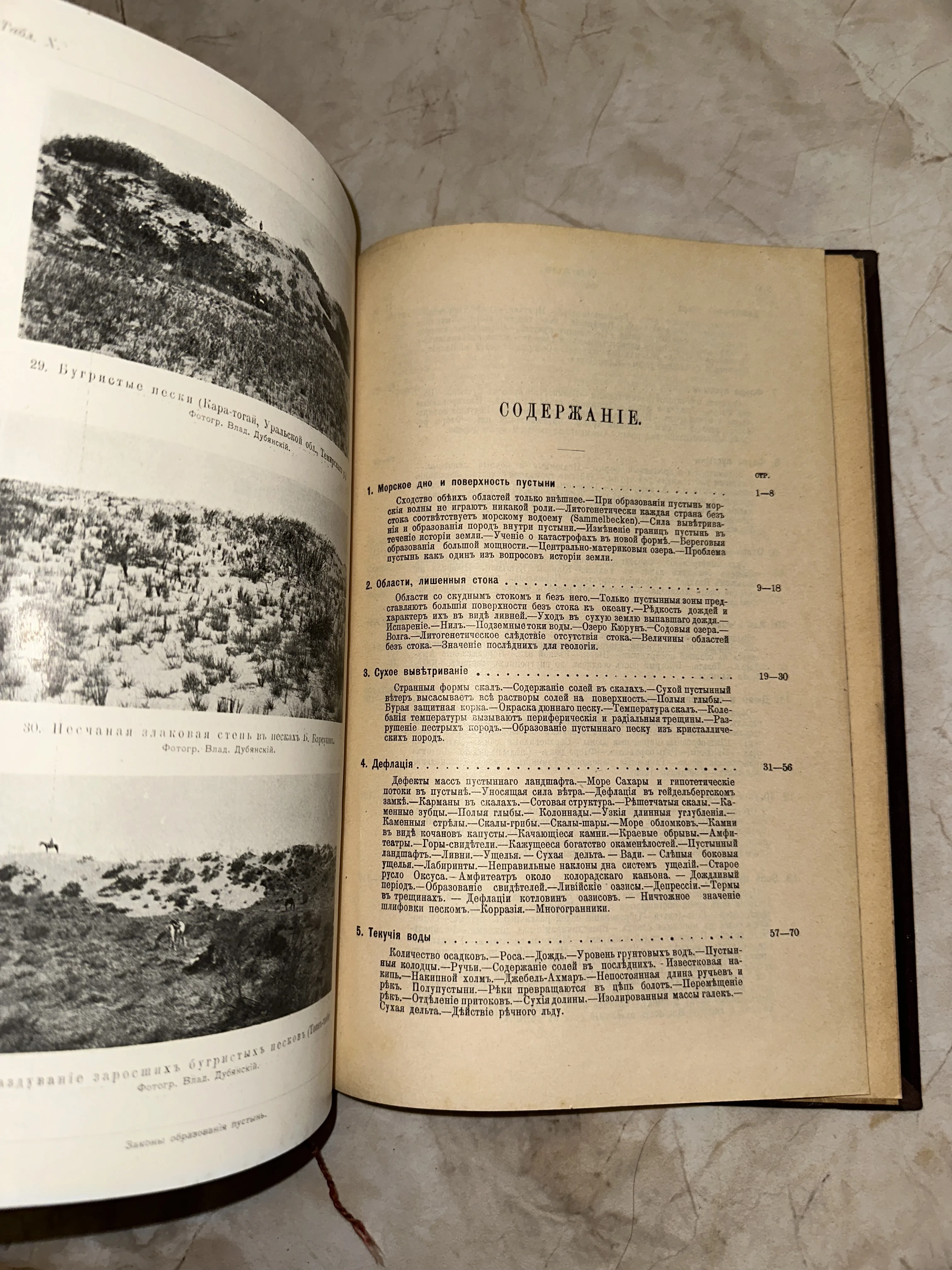 Уникальный разворот академического труда начала XX века, иллюстрированный оригинальными фототипиями экспедиций В. Дубянского. Текст, набранный в дореволюционной орфографии, и детальные пейзажи застывших песков передают строгую эстетику и научную ценность архивного издания.