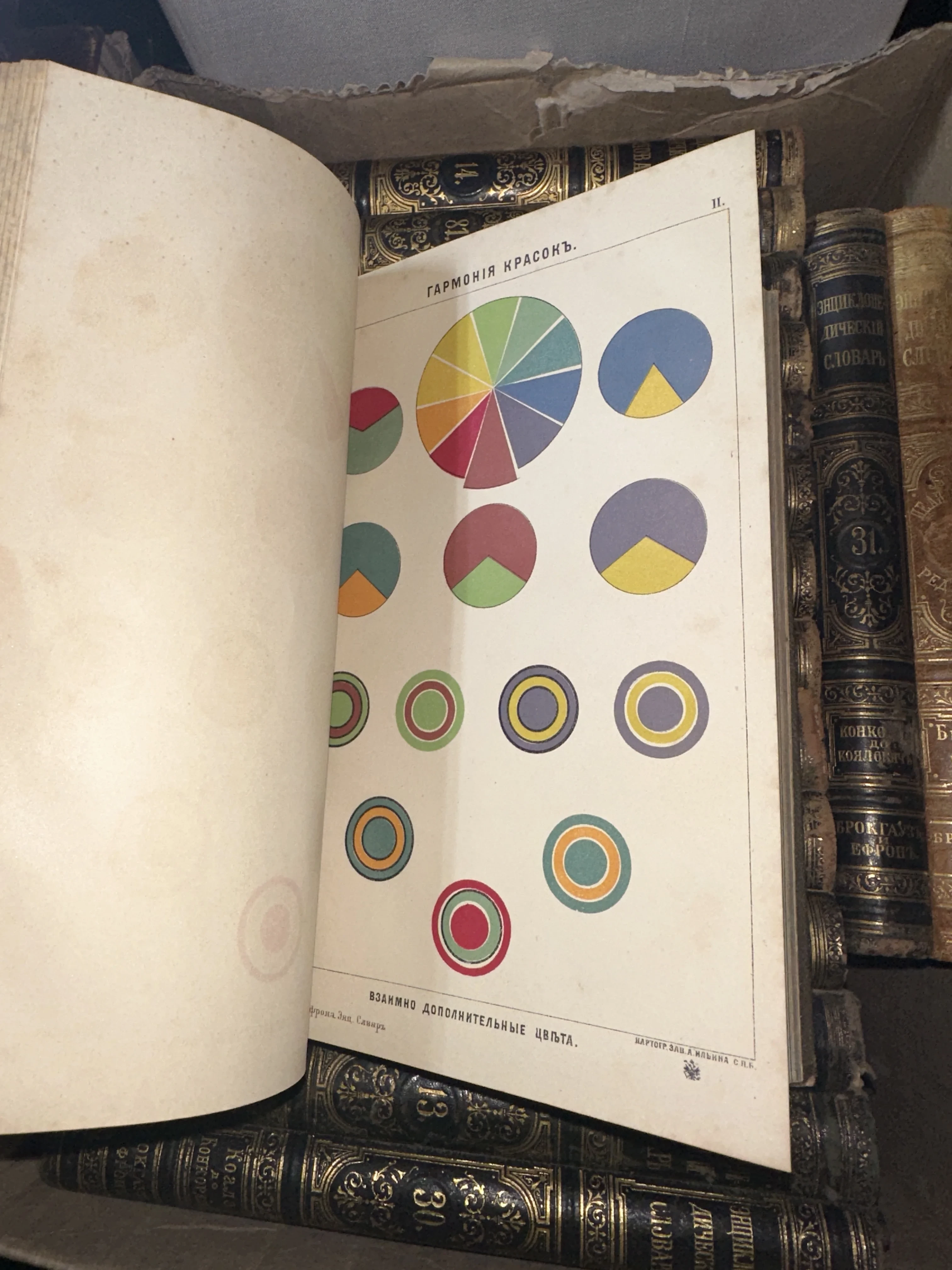 Перед вами редкий литографированный разворот из легендарного энциклопедического словаря Брокгауза и Ефрона, посвященный теории цветовой гармонии. Насыщенные пигменты диаграмм прекрасно сохранились на плотной бумаге с благородной патиной времени, создавая живой контраст с величественными золочеными корешками на заднем плане. Этот экземпляр — подлинный артефакт золотого века книгопечатания, сочетающий в себе научную точность и художественную эстетику.