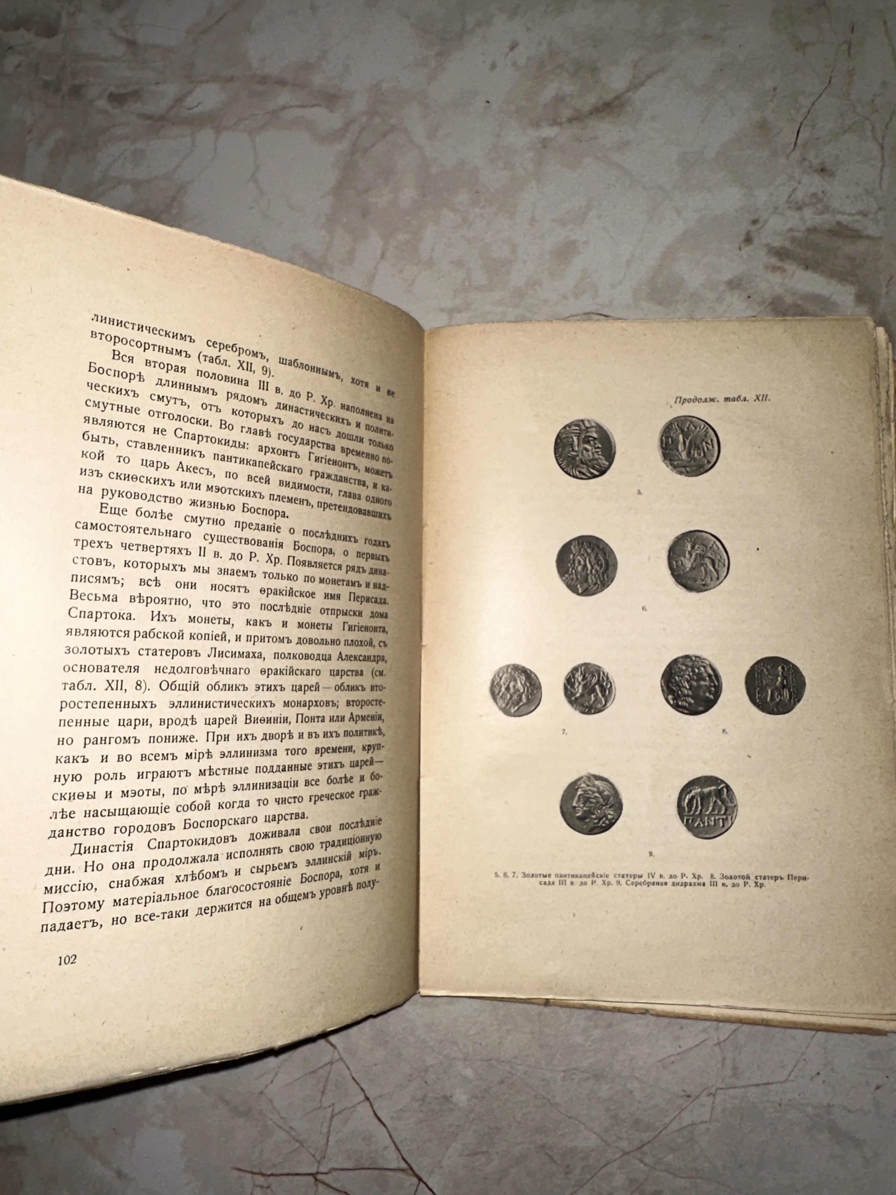 Ценный экземпляр академического издания, посвященный истории и монетному делу Боспорского царства. На страницах представлен подробный исторический очерк о династии Спартокидов, дополненный детальными таблицами с изображениями золотых статеров и серебряных драхм. Книга сохранила дух времени и представляет огромный интерес для коллекционеров-нумизматов и историков.