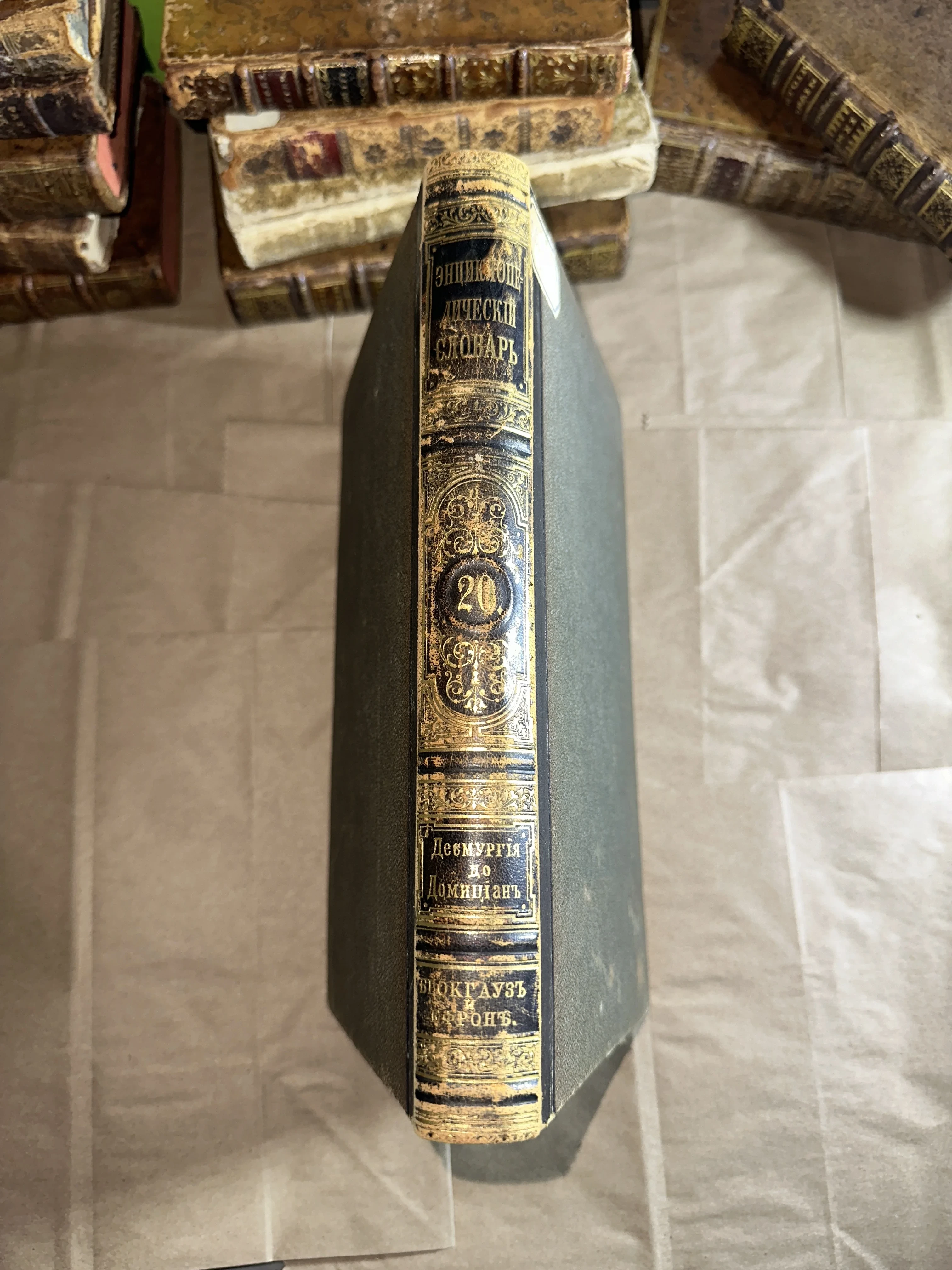 Корешок антикварного 20-го тома Энциклопедического словаря Брокгауза и Ефрона с золотым тиснением на фоне старинных книг.