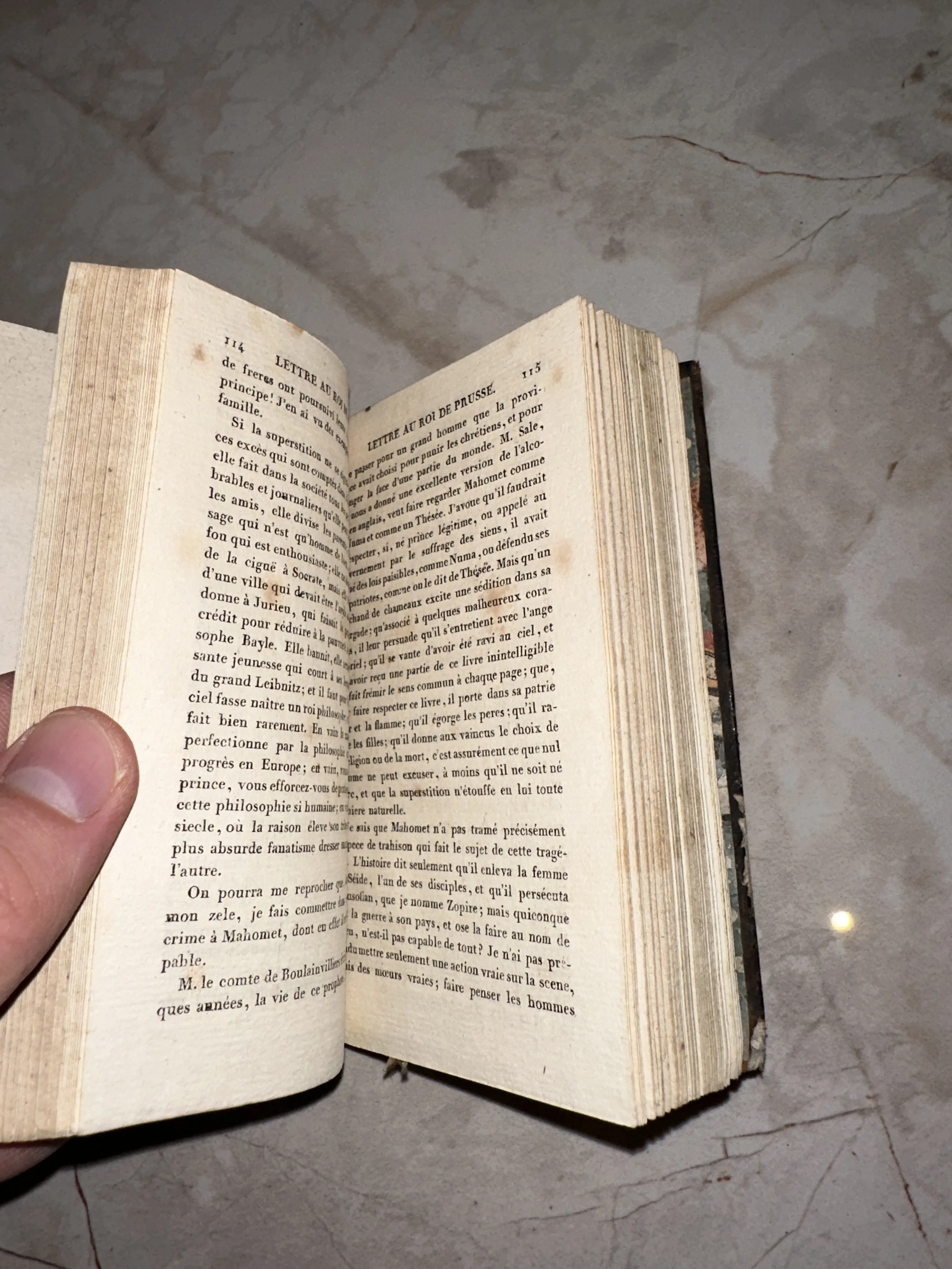 Разворот старинной книги на французском языке с пожелтевшими страницами и заголовком Lettre au roi de Prusse.