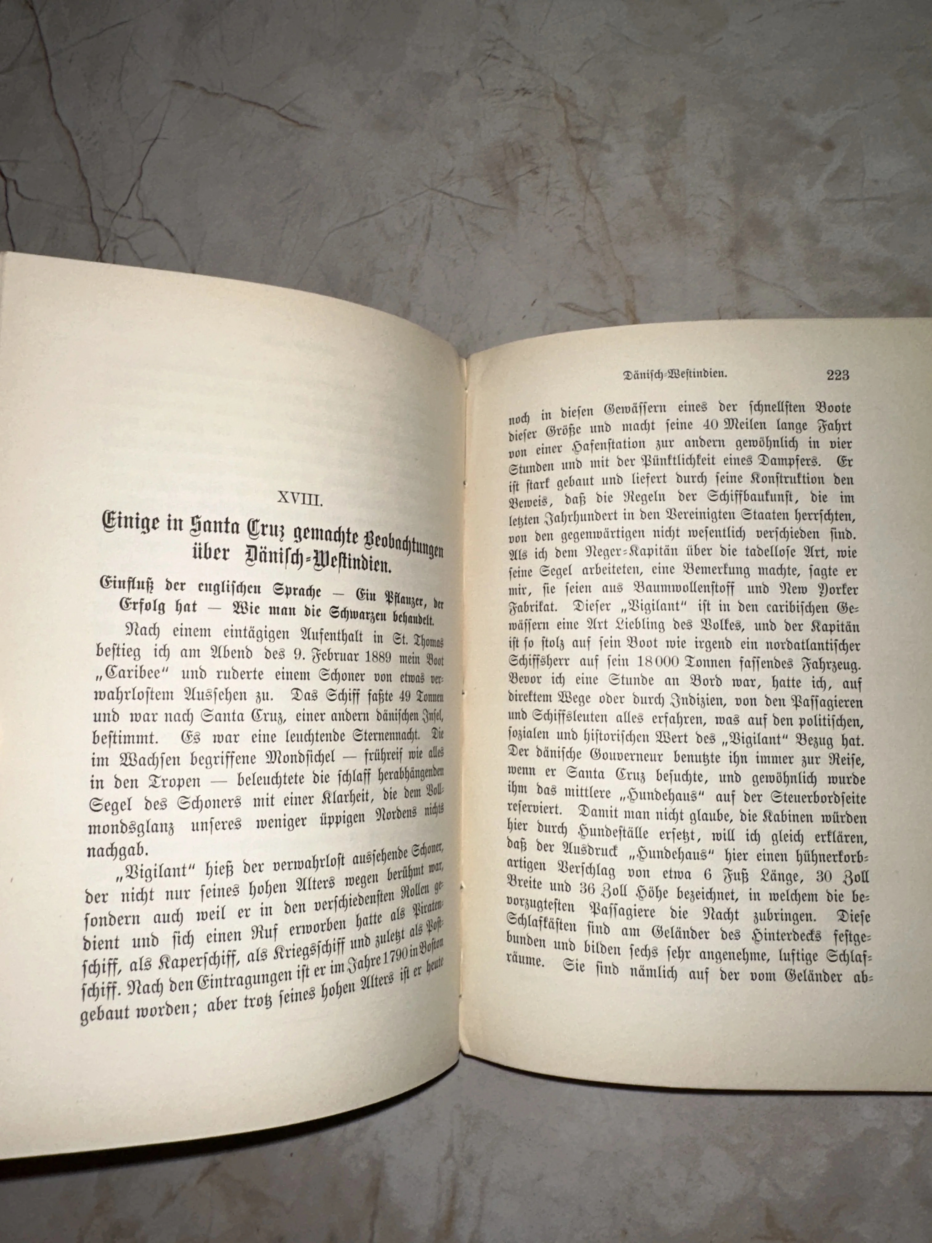 Разворот антикварной книги на немецком языке с готическим шрифтом о Датской Вест-Индии.