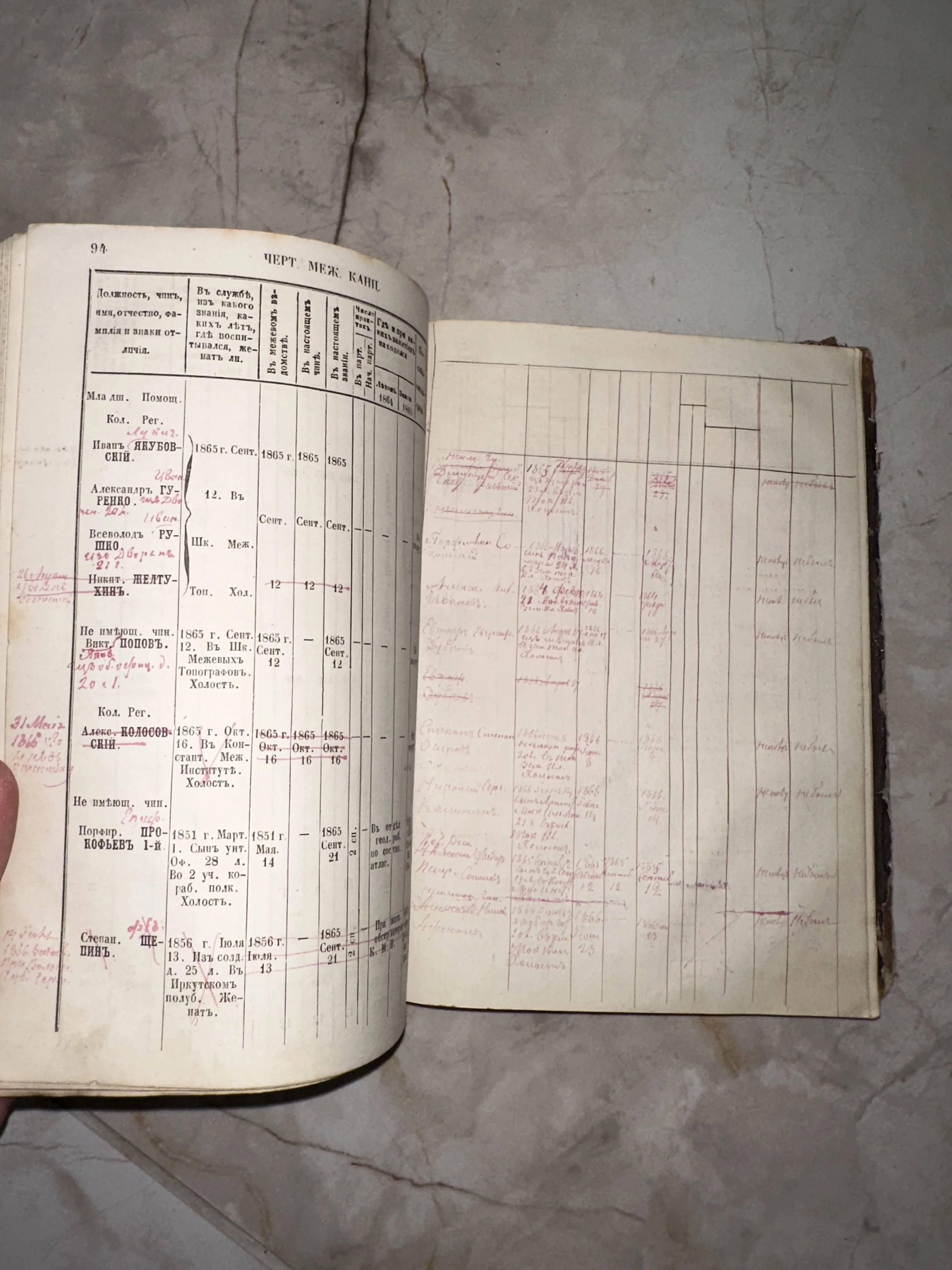 Этот редкий архивный документ середины XIX века содержит подробные списки чинов и послужные списки служащих Межевой канцелярии. Страницы украшены живыми каллиграфическими пометками и дополнениями, сделанными черными и красными чернилами, что придает предмету особую историческую достоверность. Прекрасный образец ведомственной документации в хорошей сохранности, представляющий интерес для историков и коллекционеров.