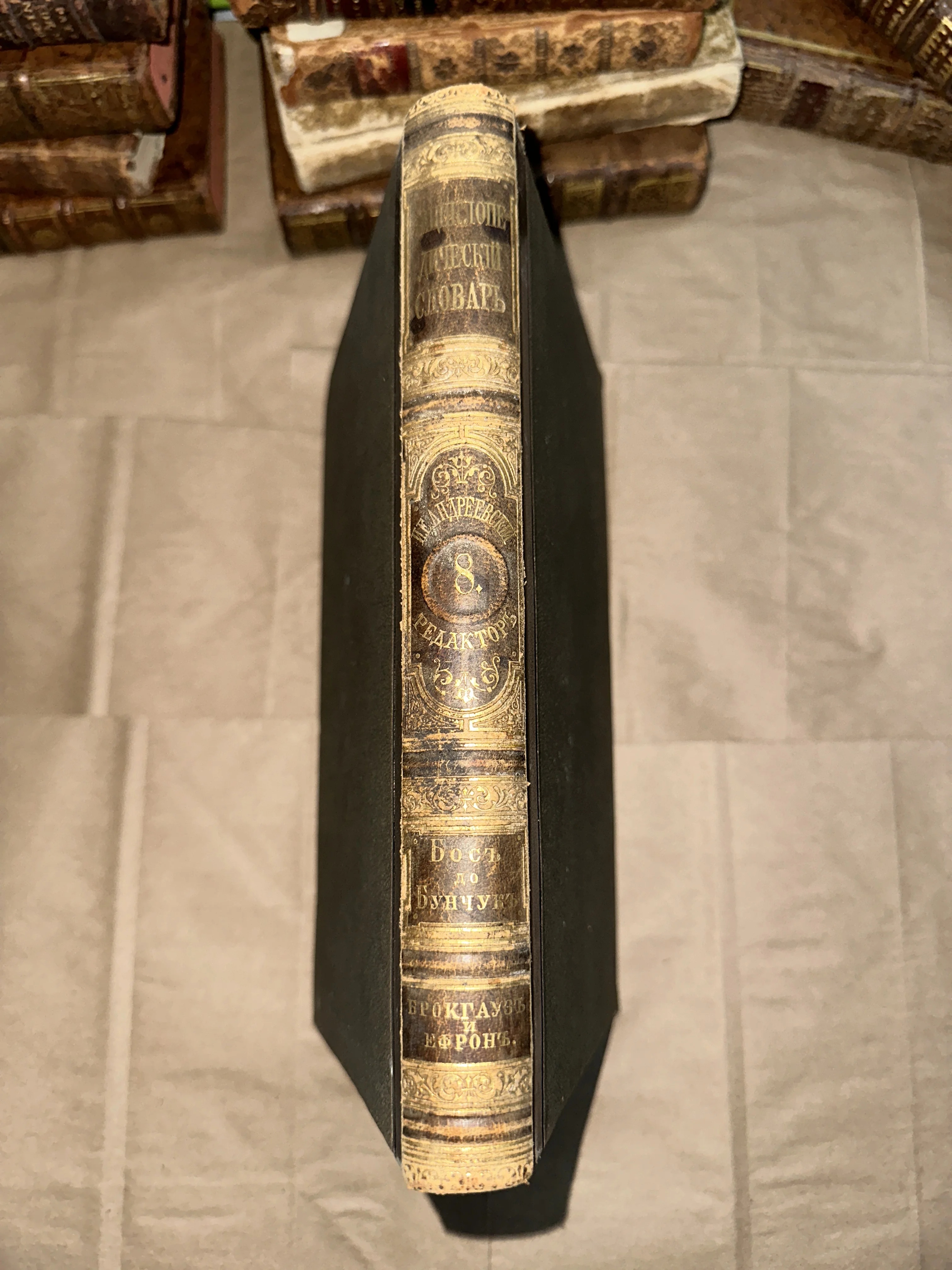 Монументальный восьмой том легендарного словаря Брокгауза и Ефрона в оригинальном полукожаном переплете с богатым золотым тиснением. Благородная патина времени на корешке и сохранившаяся четкость шрифтов передают величие имперской эпохи просвещения. Этот экземпляр станет жемчужиной классической библиотеки и подчеркнет изысканный вкус своего владельца.