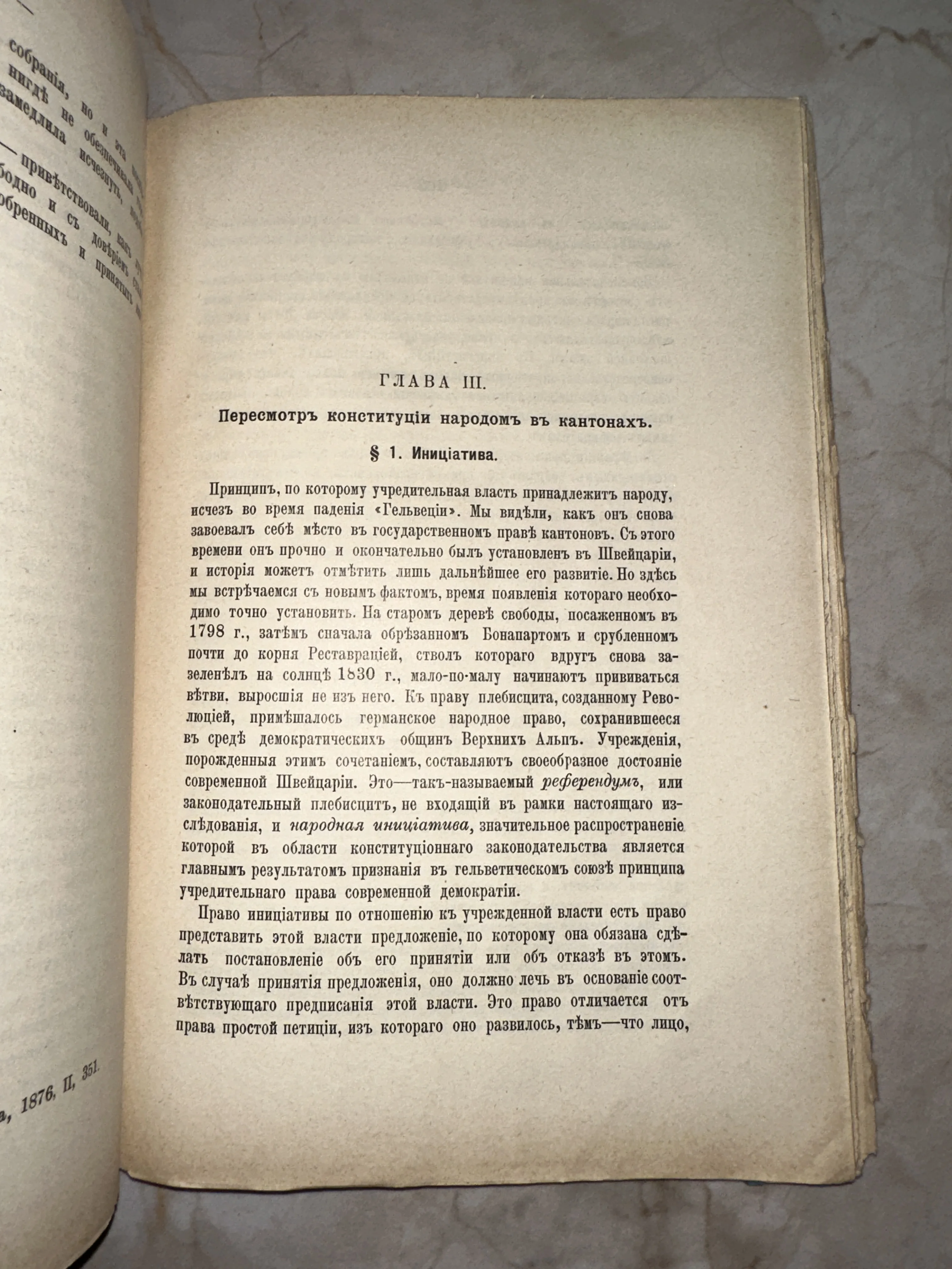 Перед вами страница из фундаментального труда, посвященного истории и развитию конституционного права. Благородная патина времени на пожелтевшей бумаге и классическая дореволюционная орфография подчеркивают аутентичность этого библиографического памятника. Издание станет ценным приобретением для коллекции историка, юриста или ценителя редких фолиантов.
