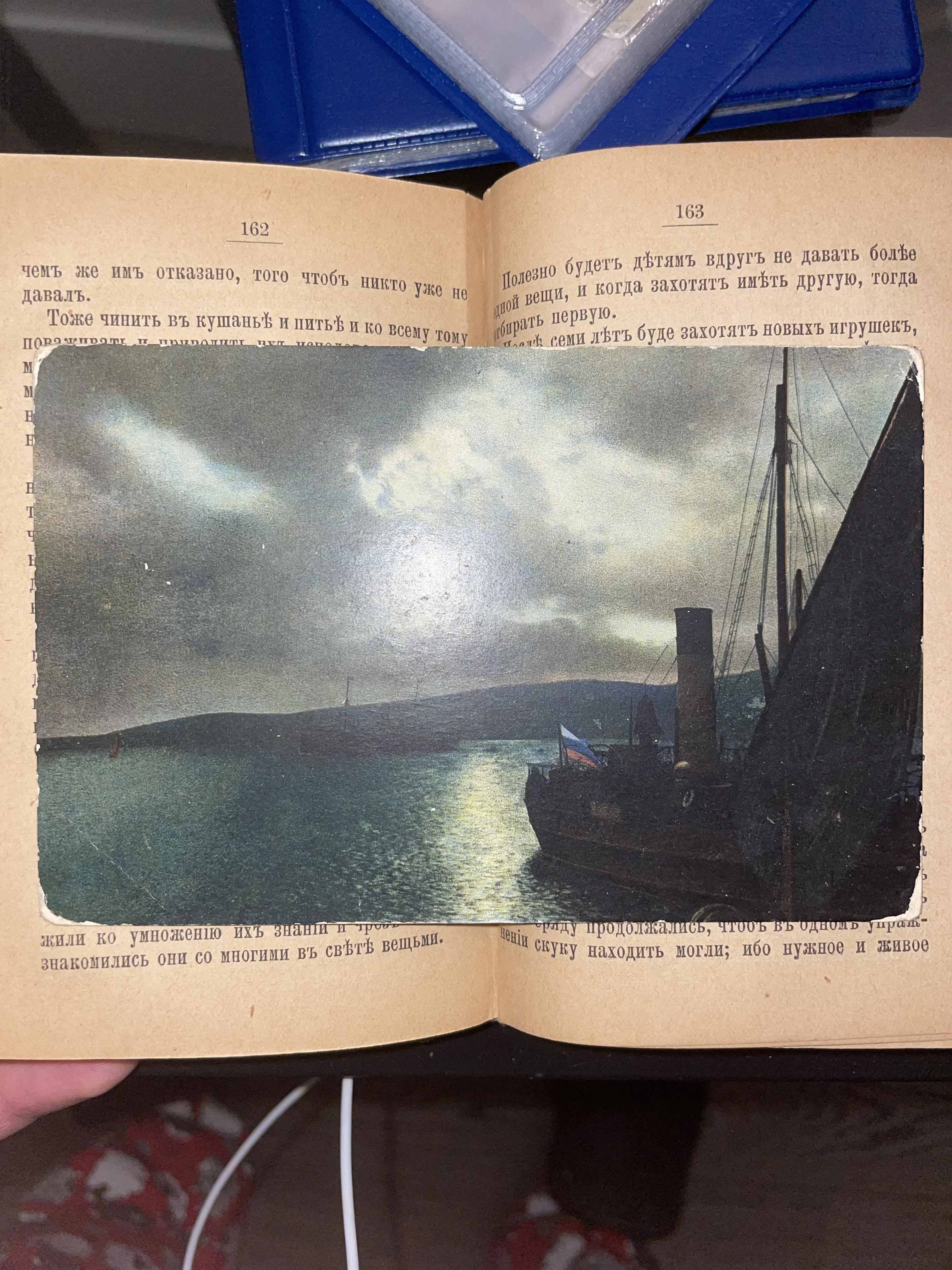 Редкая дореволюционная открытка с живописным видом судна, замершего в тихой гавани под драматичным вечерним небом. Благородные следы времени на краях карточки и соседство с пожелтевшими страницами старинного фолианта придают предмету особую коллекционную ценность и исторический шарм.