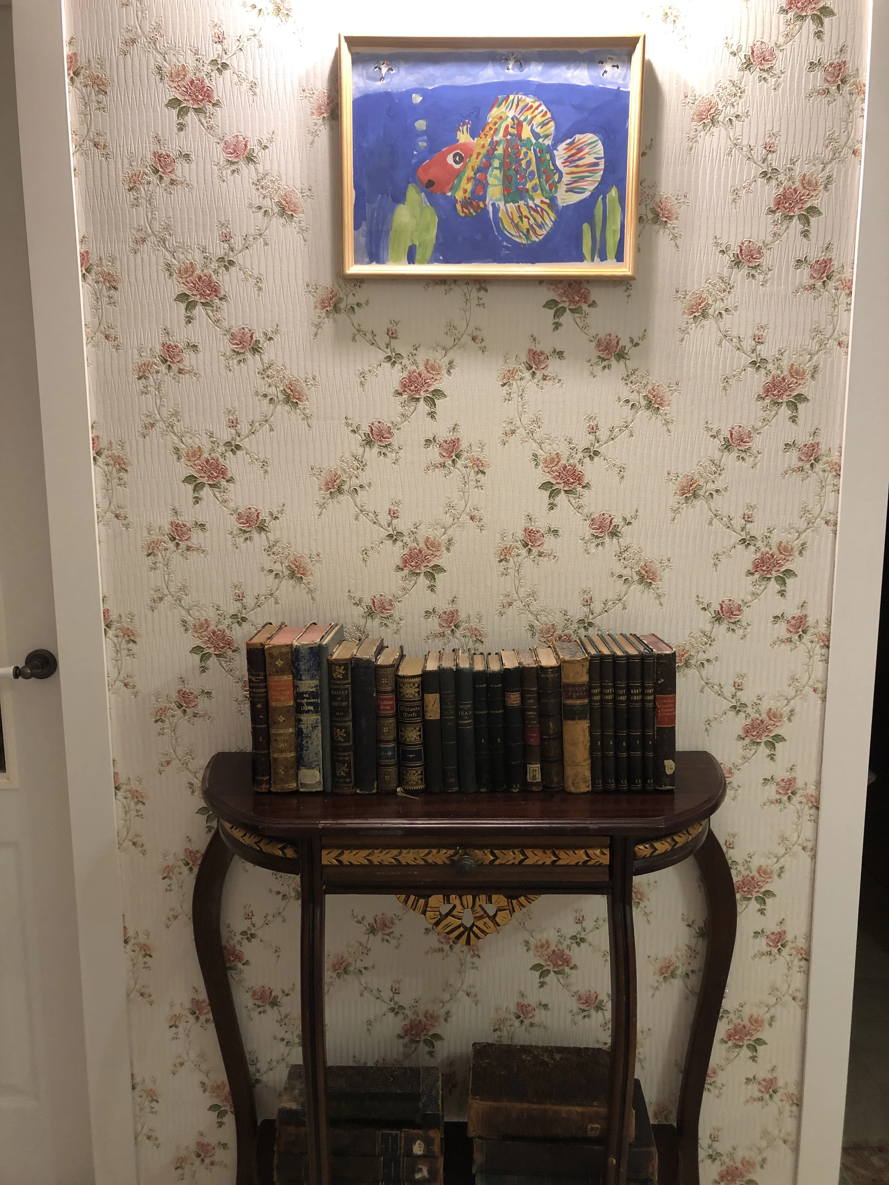 Ряд старинных книг в кожаных и тканевых переплетах на деревянном столике-консоли на фоне обоев с цветочным принтом.