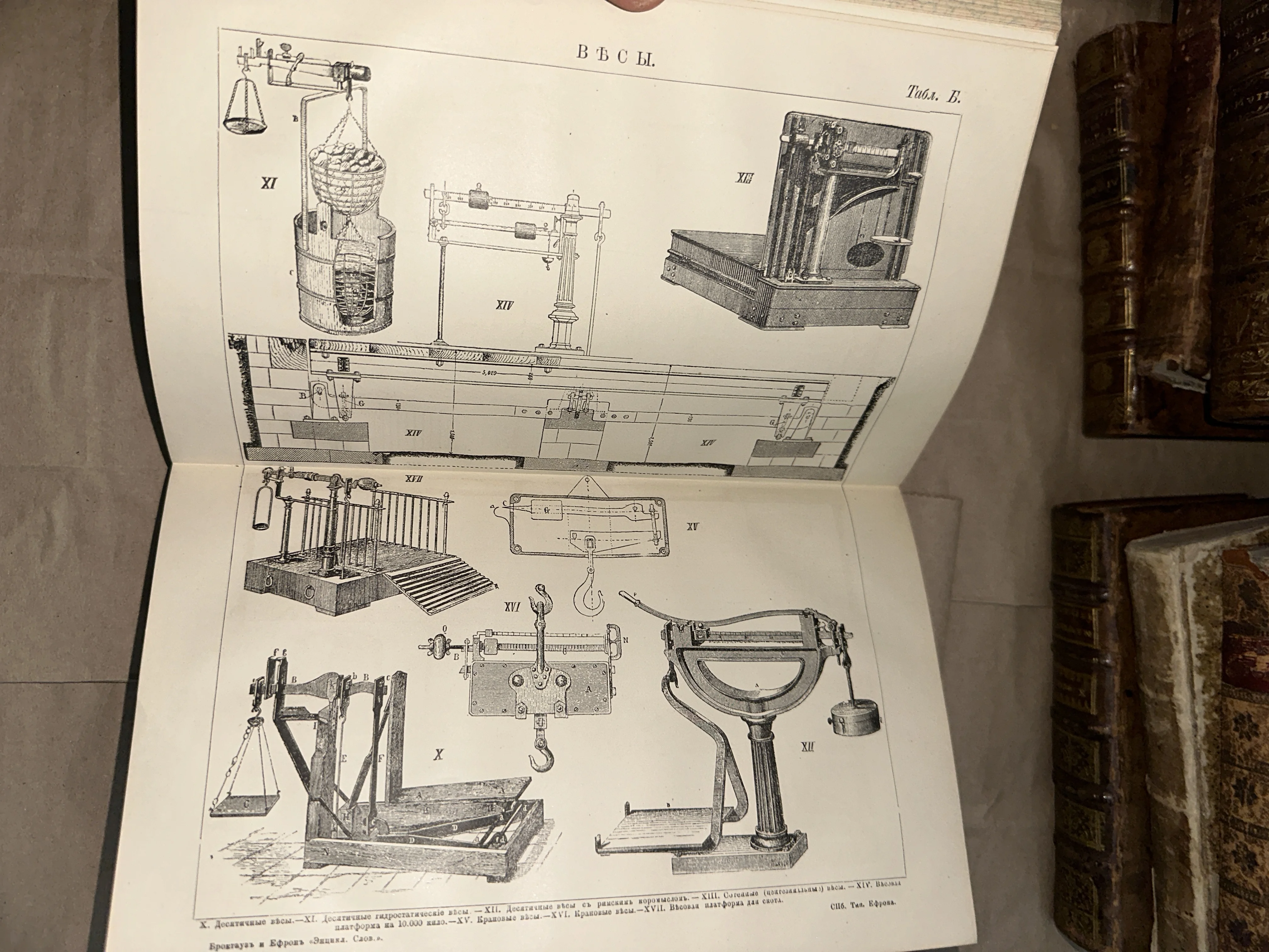 Разворот антикварной книги со схематичными изображениями различных видов весов: десятичных, гидравлических и крановых.