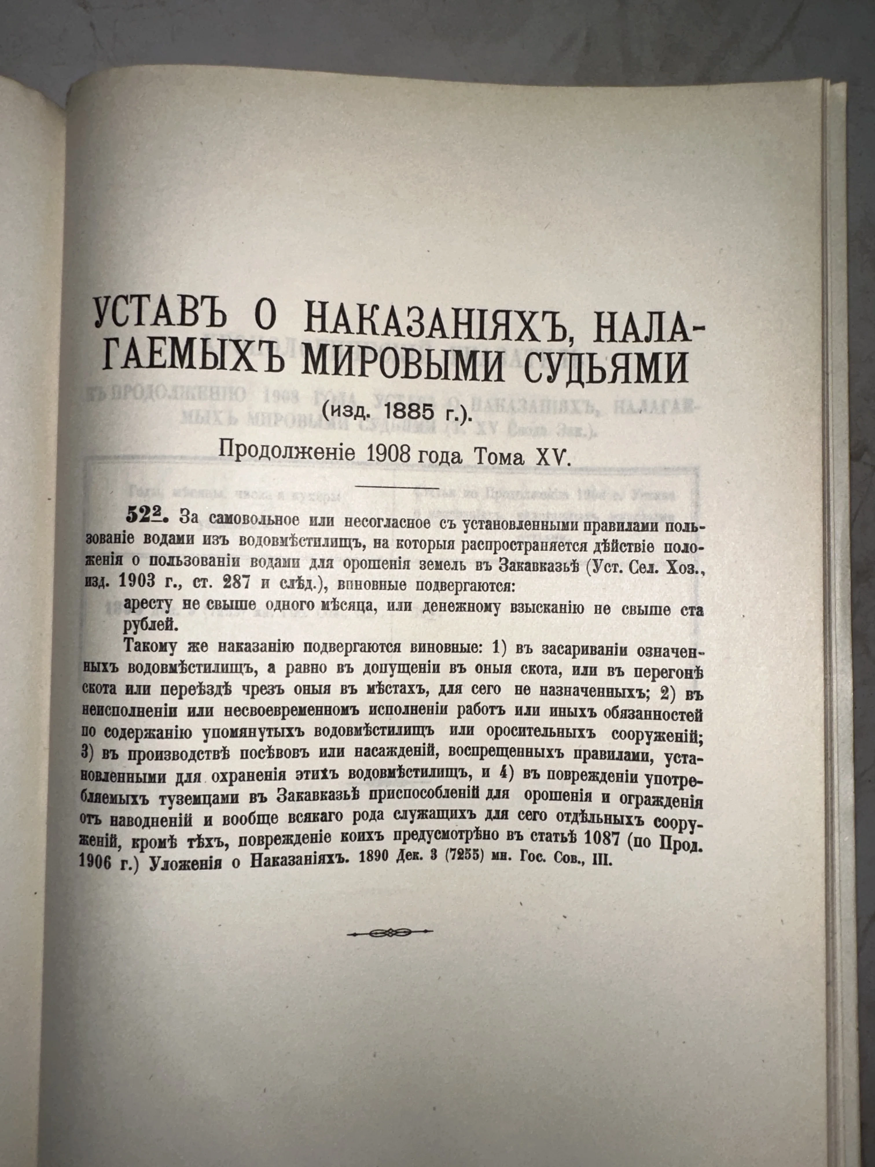 Подлинная страница дореволюционного юридического кодекса, представляющая собой продолжение Устава 1885 года. Текст выполнен классическим типографским шрифтом с использованием дореформенной орфографии, что придает изданию особую историческую ценность и шарм эпохи Российской Империи.