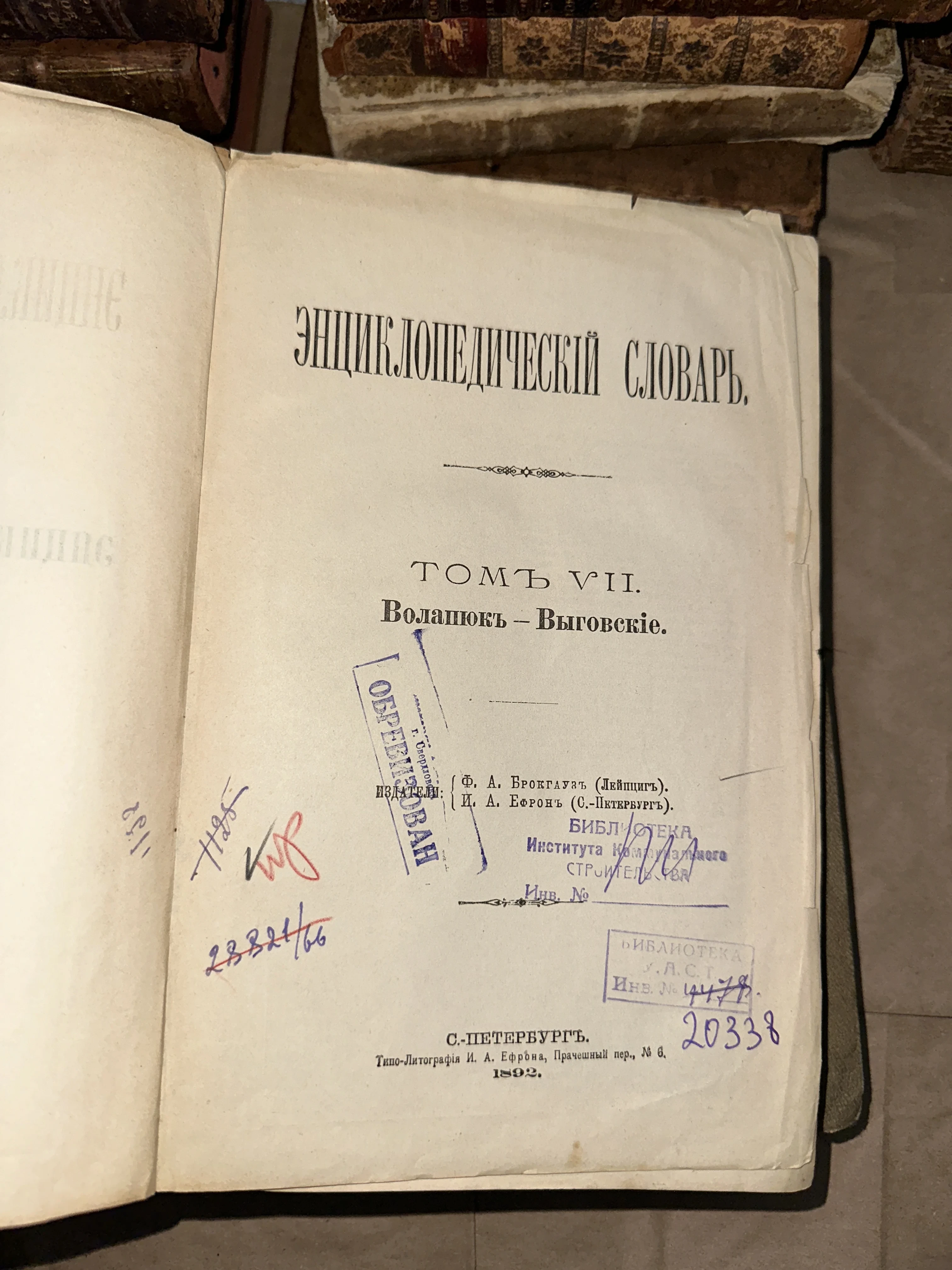 Перед вами титульный лист легендарного седьмого тома словаря Брокгауза и Ефрона, охватывающего статьи от «Волапюка» до «Выговских». Издание несет на себе печать времени в виде аутентичных библиотечных штампов и архивных помет, что делает его ценным свидетелем истории книжного дела имперской России.