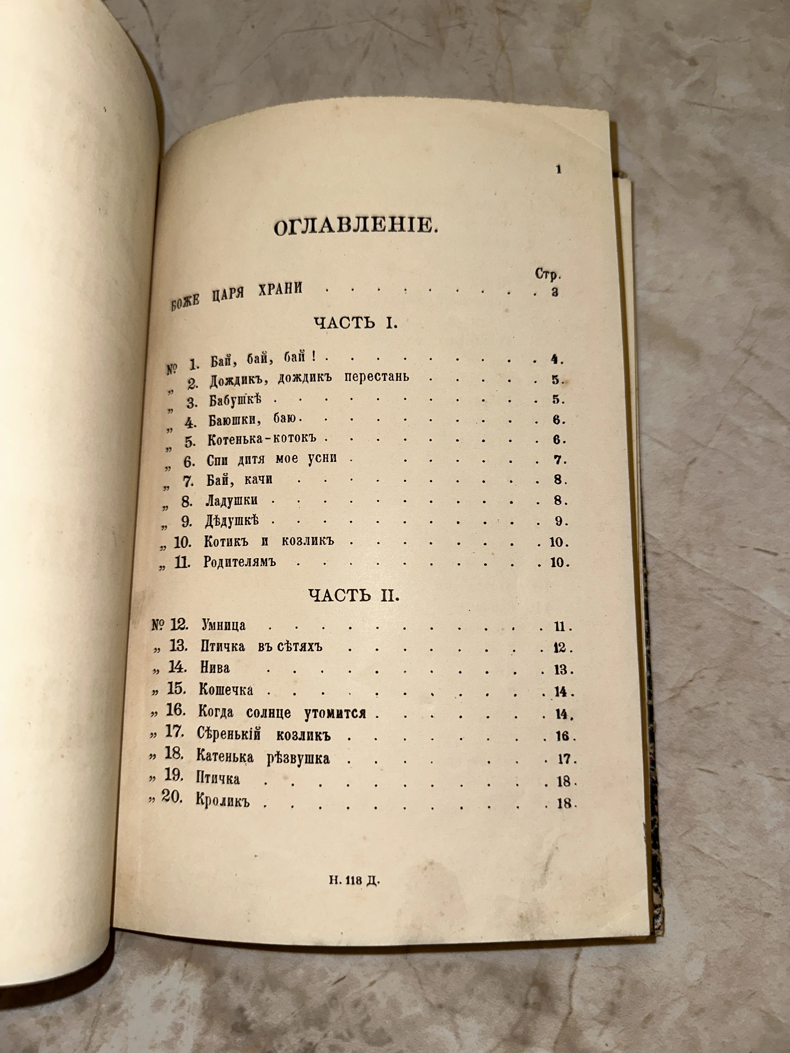 Фотография страницы с оглавлением антикварной книги, содержащей детские стихи и колыбельные на дореформенном русском языке.