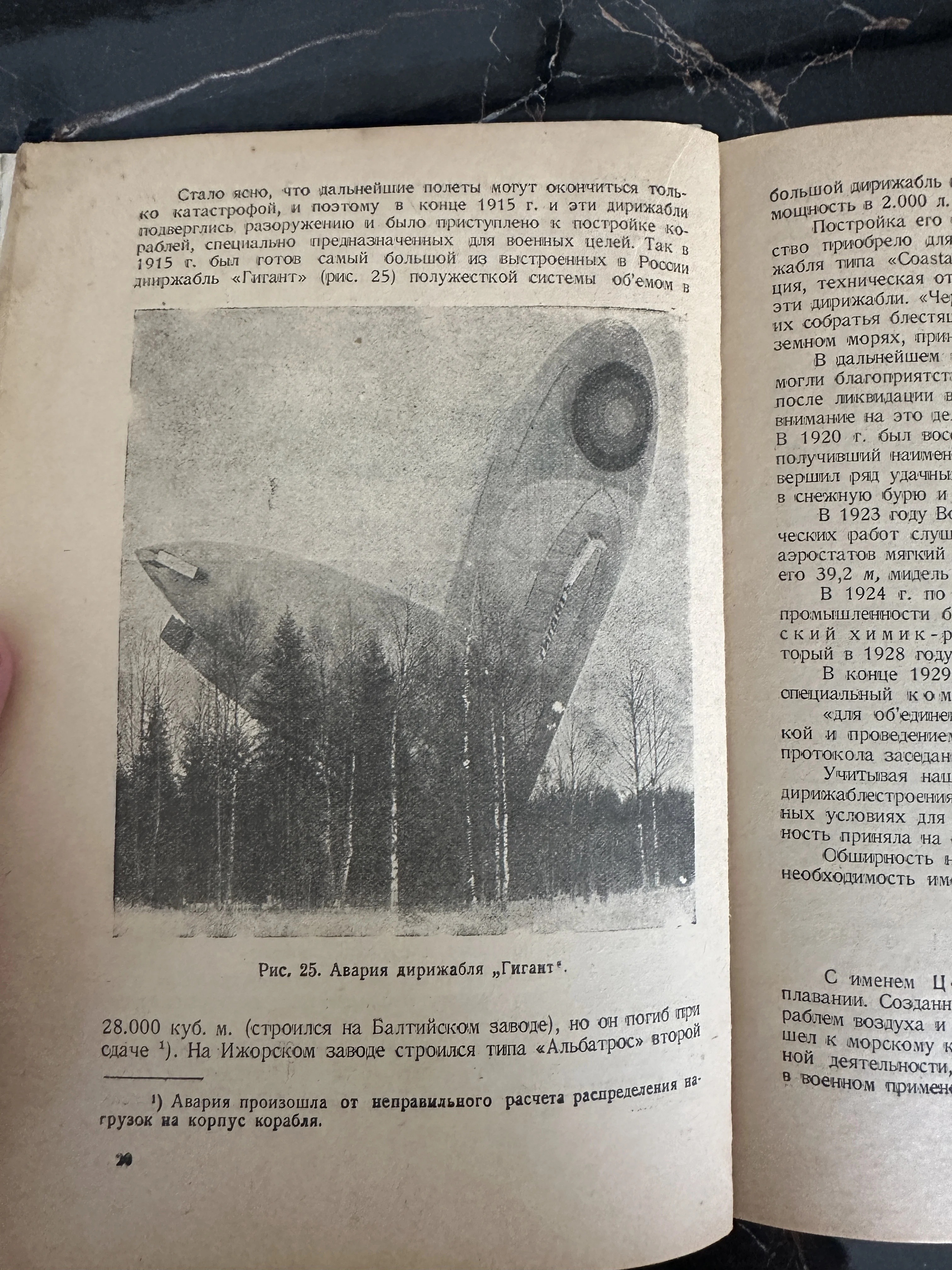 Страница старой книги с текстом и черно-белой фотографией упавшего дирижабля Гигант среди соснового леса.