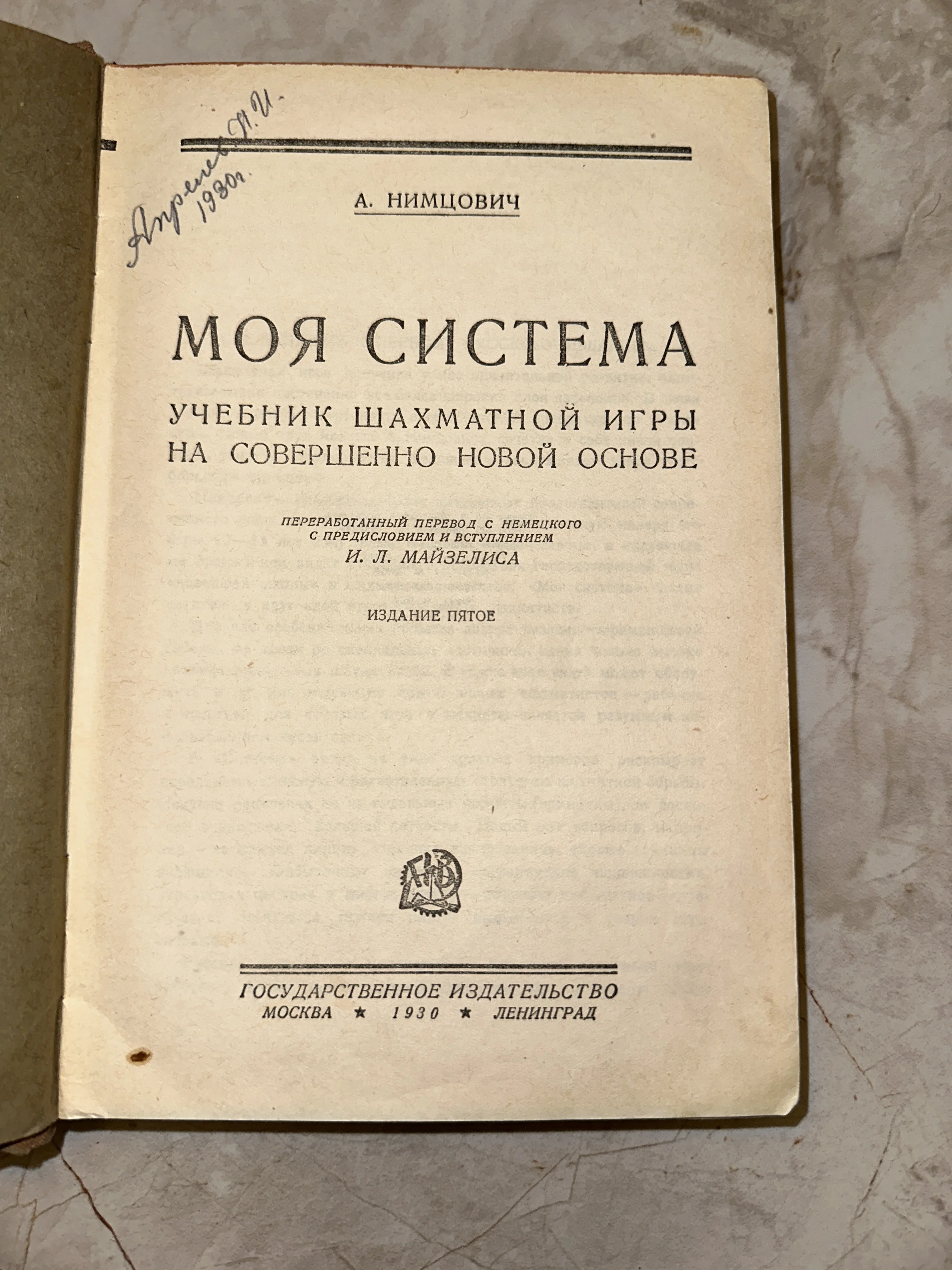 Редкое пятое издание легендарного шахматного учебника, совершившего революцию в теории игры начала XX века. На титульном листе сохранилась уникальная дарственная или владельческая надпись, датированная апрелем 1930 года, что придает экземпляру особую историческую ценность. Книга представляет собой прекрасный образец раннего советского книгоиздания в достойном коллекционном состоянии.