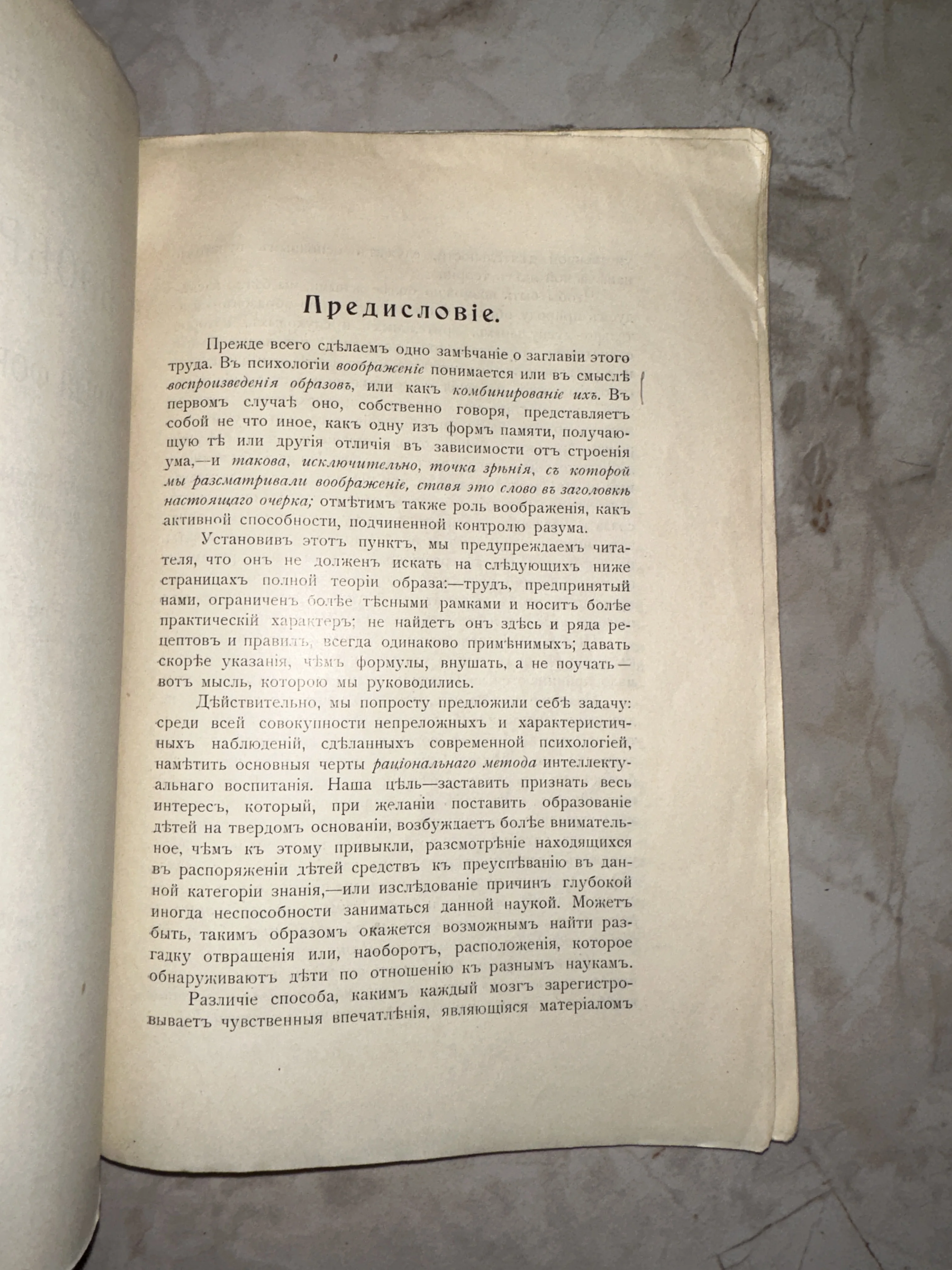 Этот редкий бумажный артефакт представляет собой философское размышление о природе воображения и методах воспитания интеллекта. Страница сохранила благородный желтоватый оттенок и фактуру бумаги начала XX века, передавая атмосферу классического научного кабинета. Идеальный образец для коллекционеров старинной литературы и исследователей истории педагогики.