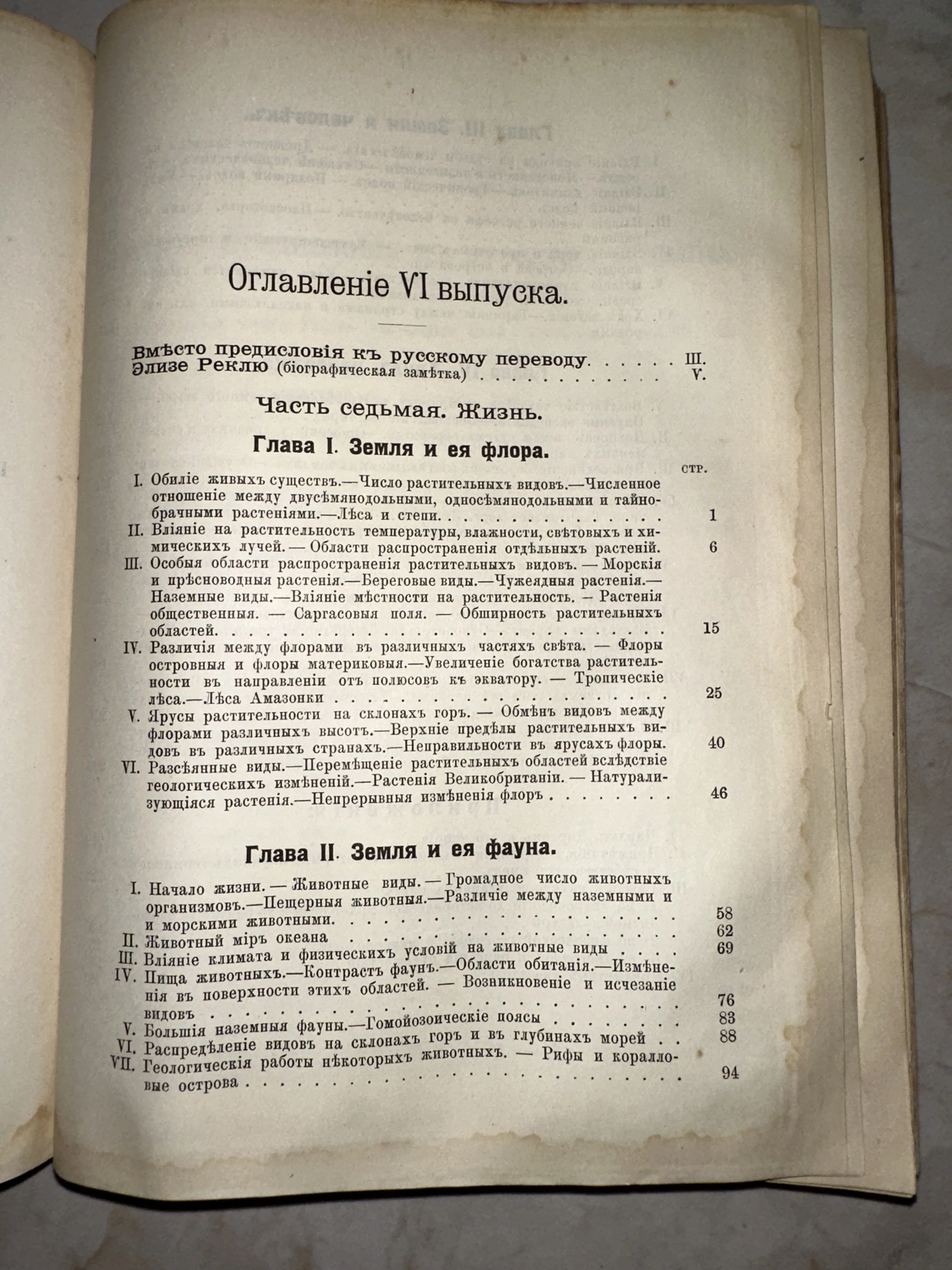 Перед вами страница из фундаментального труда знаменитого географа Элизе Реклю, посвященная жизни Земли, её флоре и фауне. Пожелтевшая бумага с благородной патиной времени и четкий дореволюционный шрифт передают атмосферу серьезного научного поиска конца XIX века. Превосходный экземпляр для коллекционеров старинной естественнонаучной литературы и любителей истории науки.