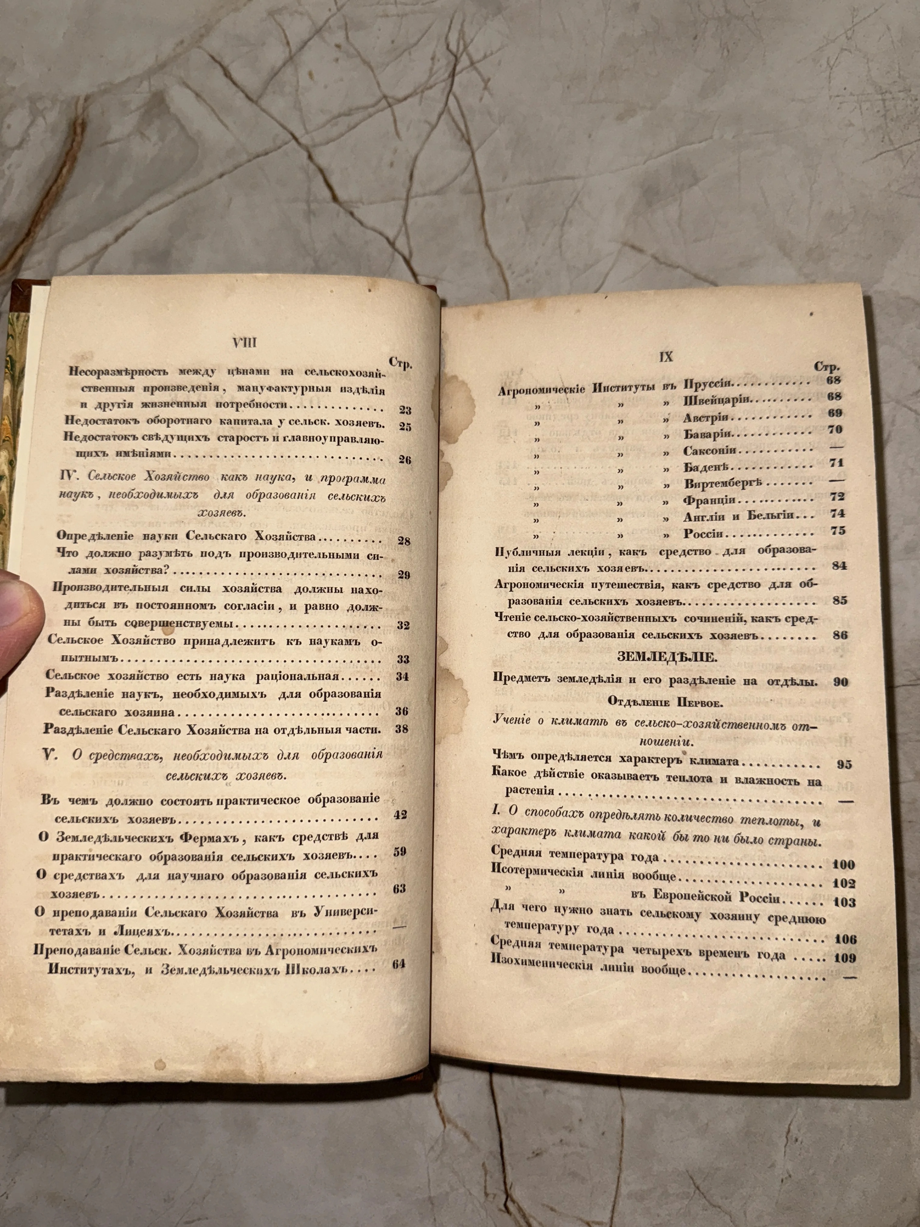 Разворот старинной книги с оглавлением на дореволюционном русском языке, посвященный агрономии и климатологии.