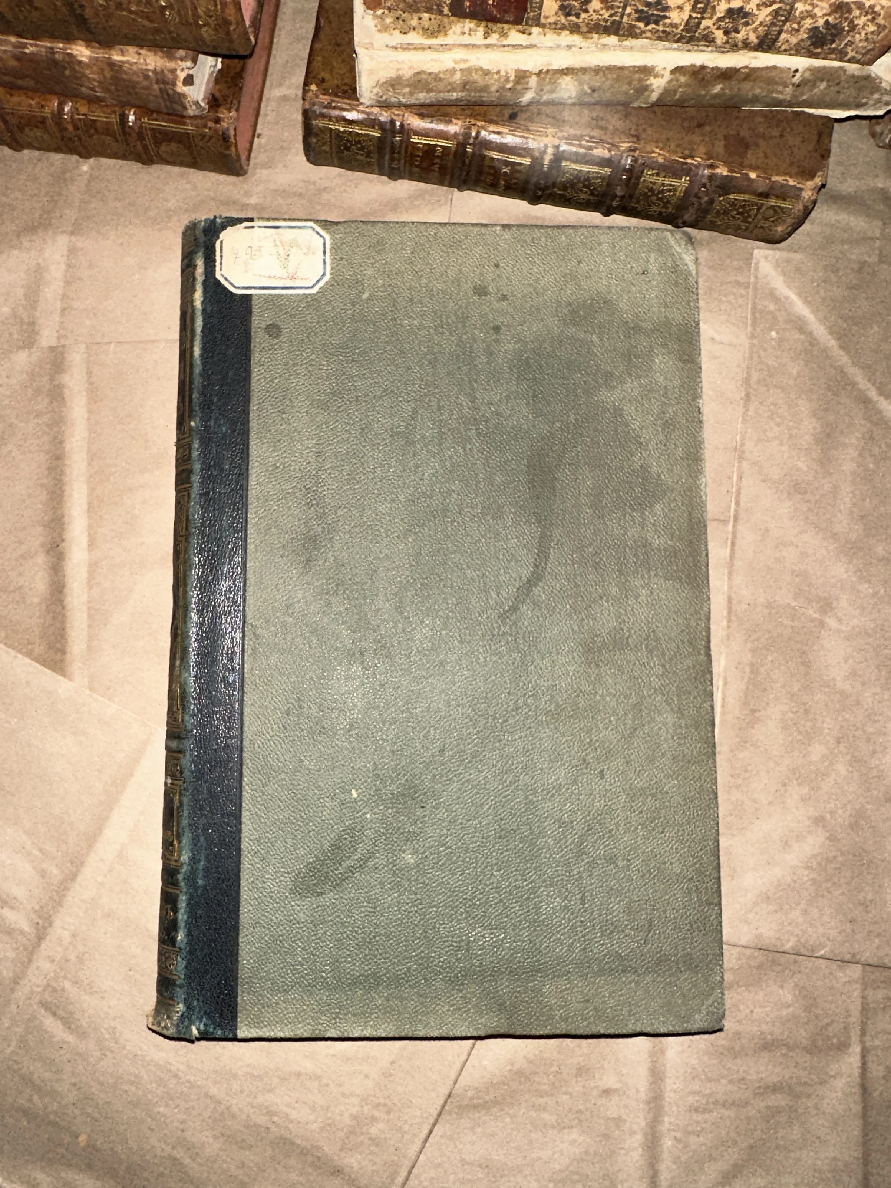 Антикварная книга с серой текстурированной обложкой и темным кожаным корешком на фоне других старых томов.