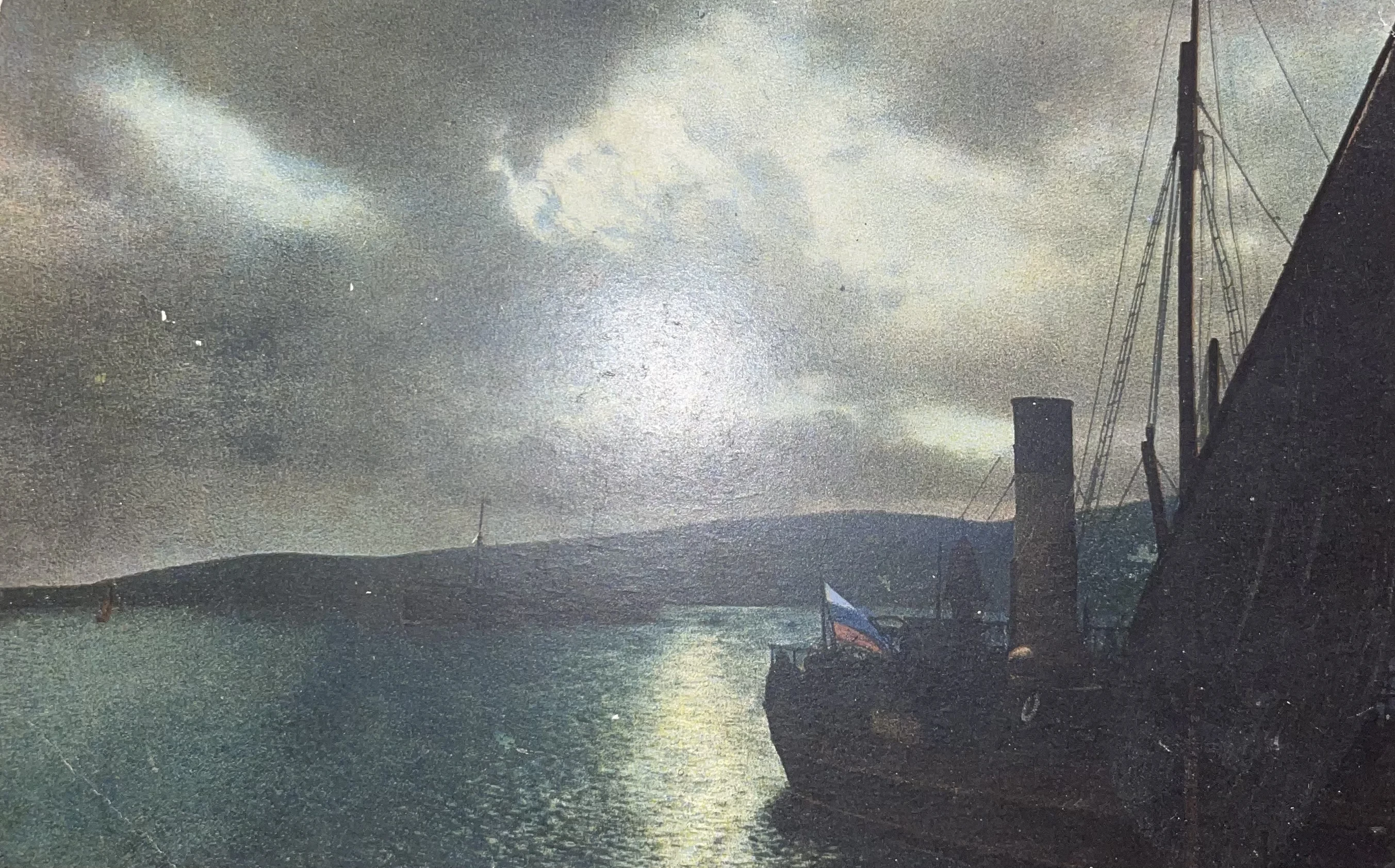 Живописный морской вид, передающий суровую красоту и величие парового флота прошлых лет. Драматичное небо с пробивающимися лучами света создает уникальную атмосферу спокойствия перед бурей, а детальное изображение судна подчеркивает историческую ценность кадра. Коллекционный экземпляр с прекрасной передачей светотени и глубины пространства.