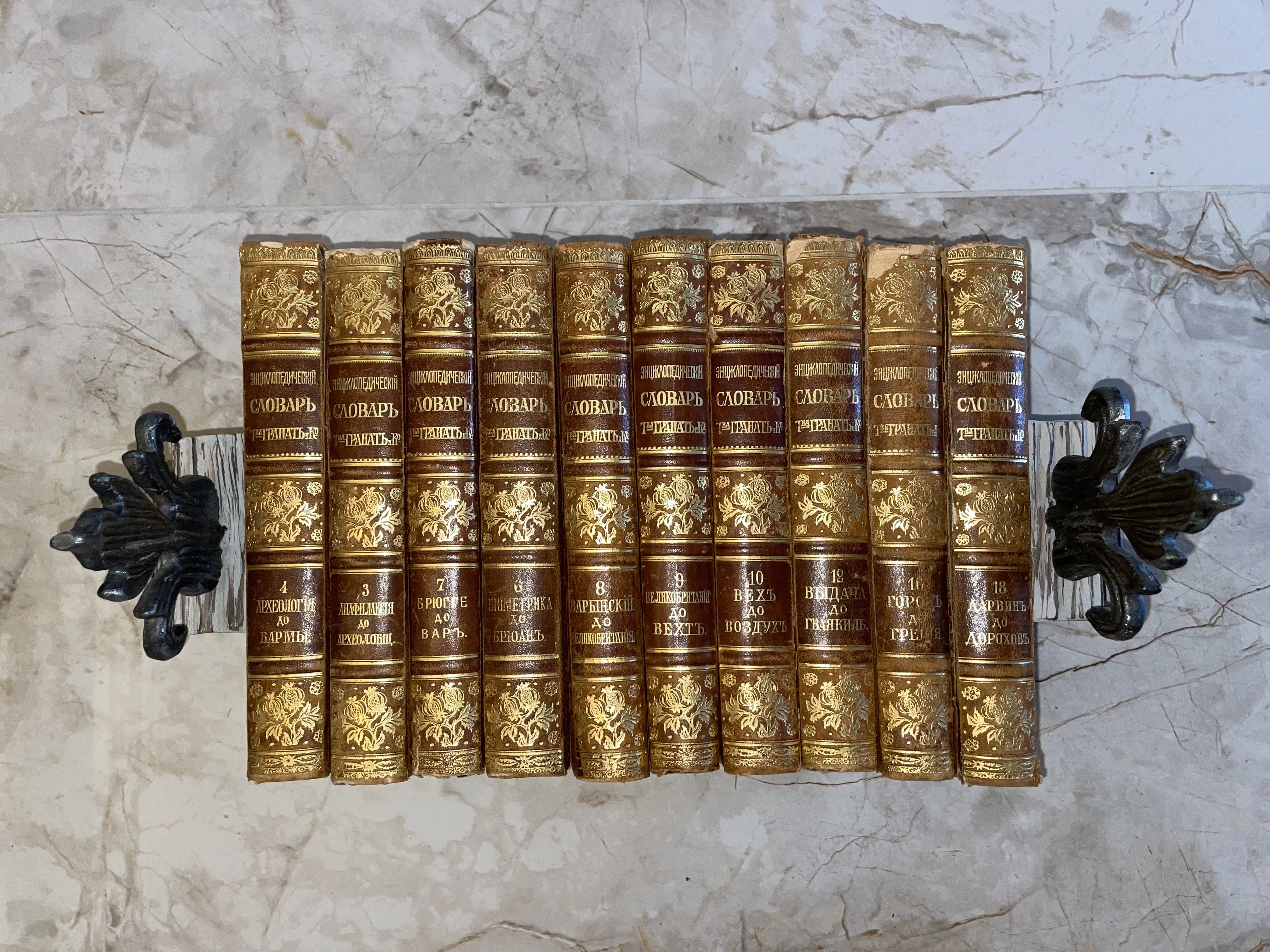 Великолепное собрание томов легендарного энциклопедического словаря товарищества «Гранат» в изысканных переплетах с богатым растительным орнаментом и золотым тиснением. Каждый корешок хранит благородную патину времени, подчеркивая монументальность и историческую значимость этого фундаментального издания начала XX века. Идеальный выбор для украшения классического кабинета или пополнения серьезной коллекции антикварной литературы.
