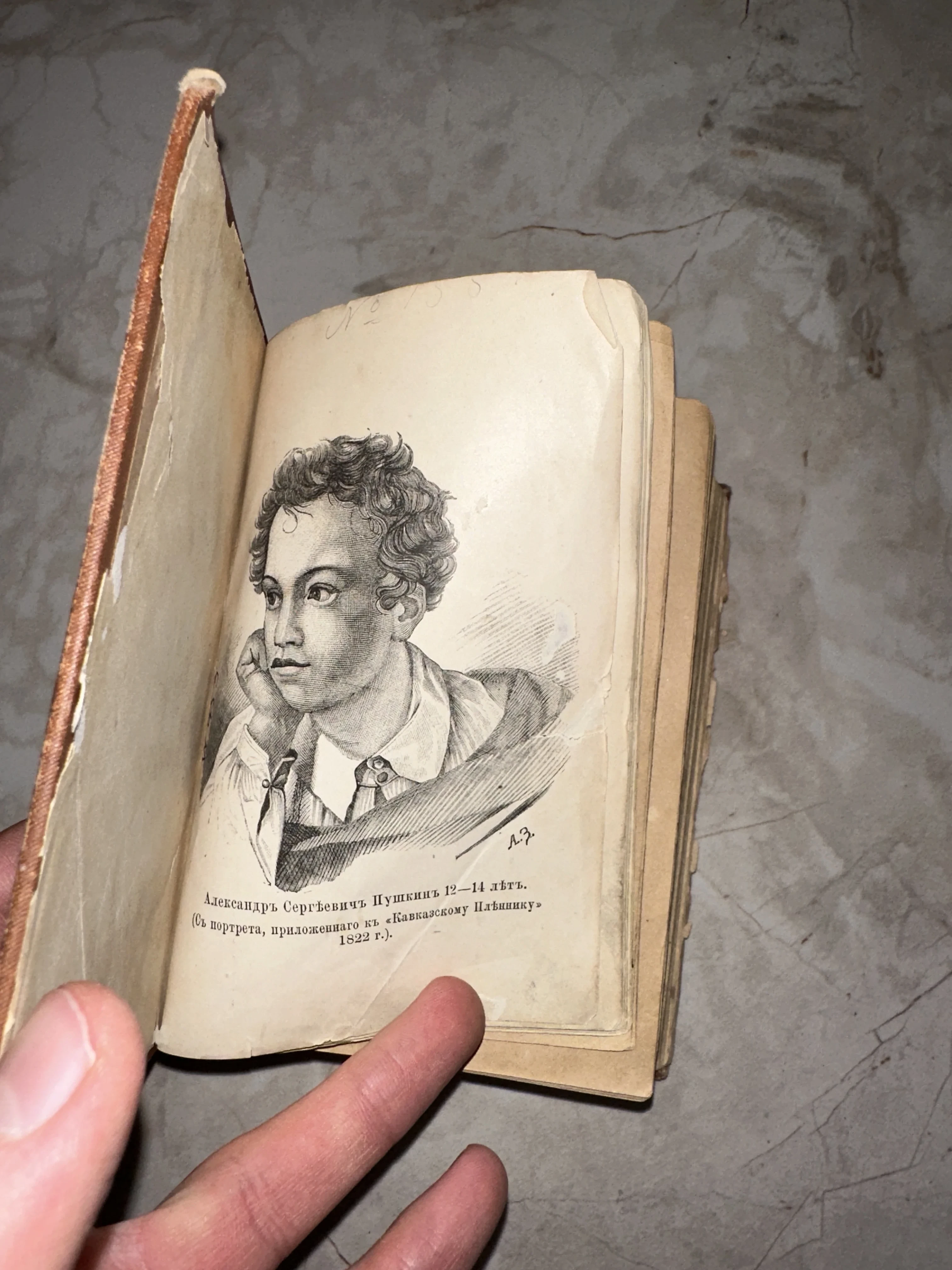 Уникальный фрагмент истории — гравированный портрет юного Пушкина, запечатлевший поэта в возрасте 12–14 лет. Страницы антикварного издания хранят благородную патину времени, передавая атмосферу литературных салонов XIX века через детальную штриховку и аутентичный шрифт. Этот предмет станет жемчужиной коллекции для истинного ценителя русской классики и библиофила.