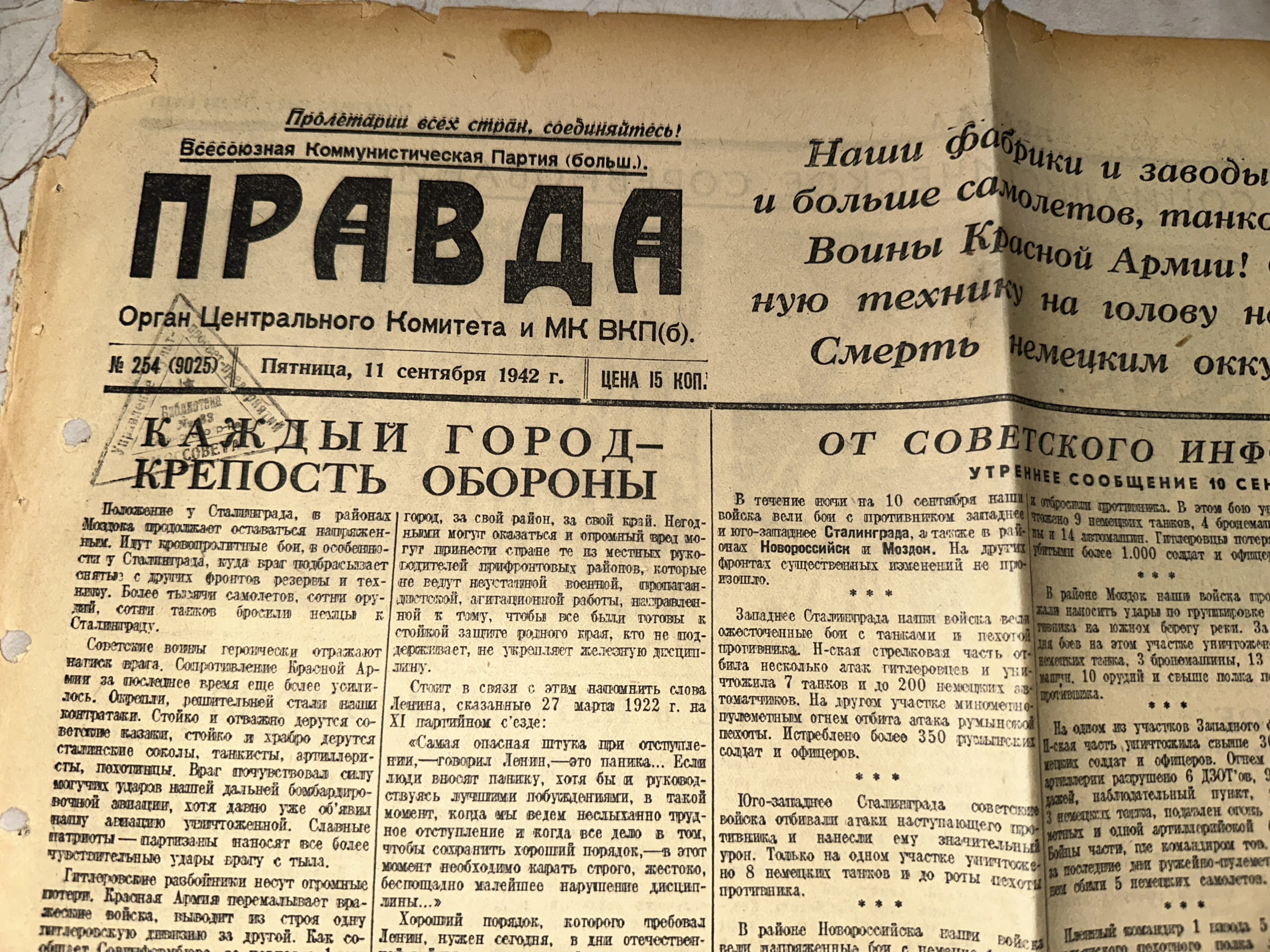 Газета «Правда» от 11 сентября 1942 года