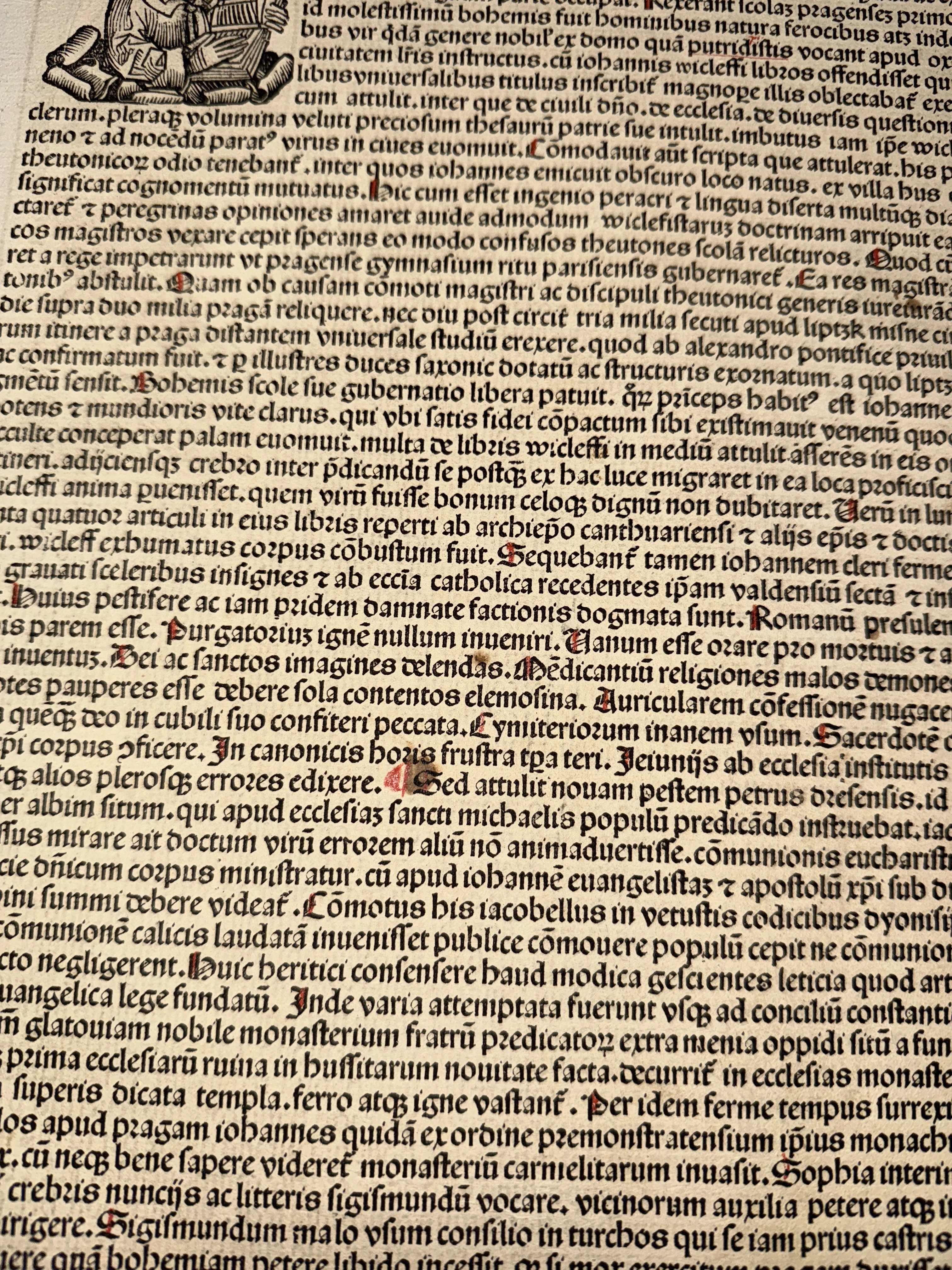 Крупный план страницы старинной книги с латинским текстом, выполненным готическим шрифтом, и фрагментом гравюры сверху.