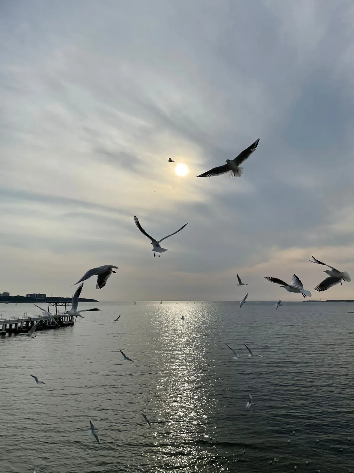 Завораживающий морской пейзаж, запечатлевший свободный полет чаек в мягких лучах уходящего солнца. Композиция наполнена безмятежностью и свежестью бриза, напоминая классические маринистические этюды прошлого века. Этот кадр идеально передает ускользающую красоту момента и гармонию дикой природы.