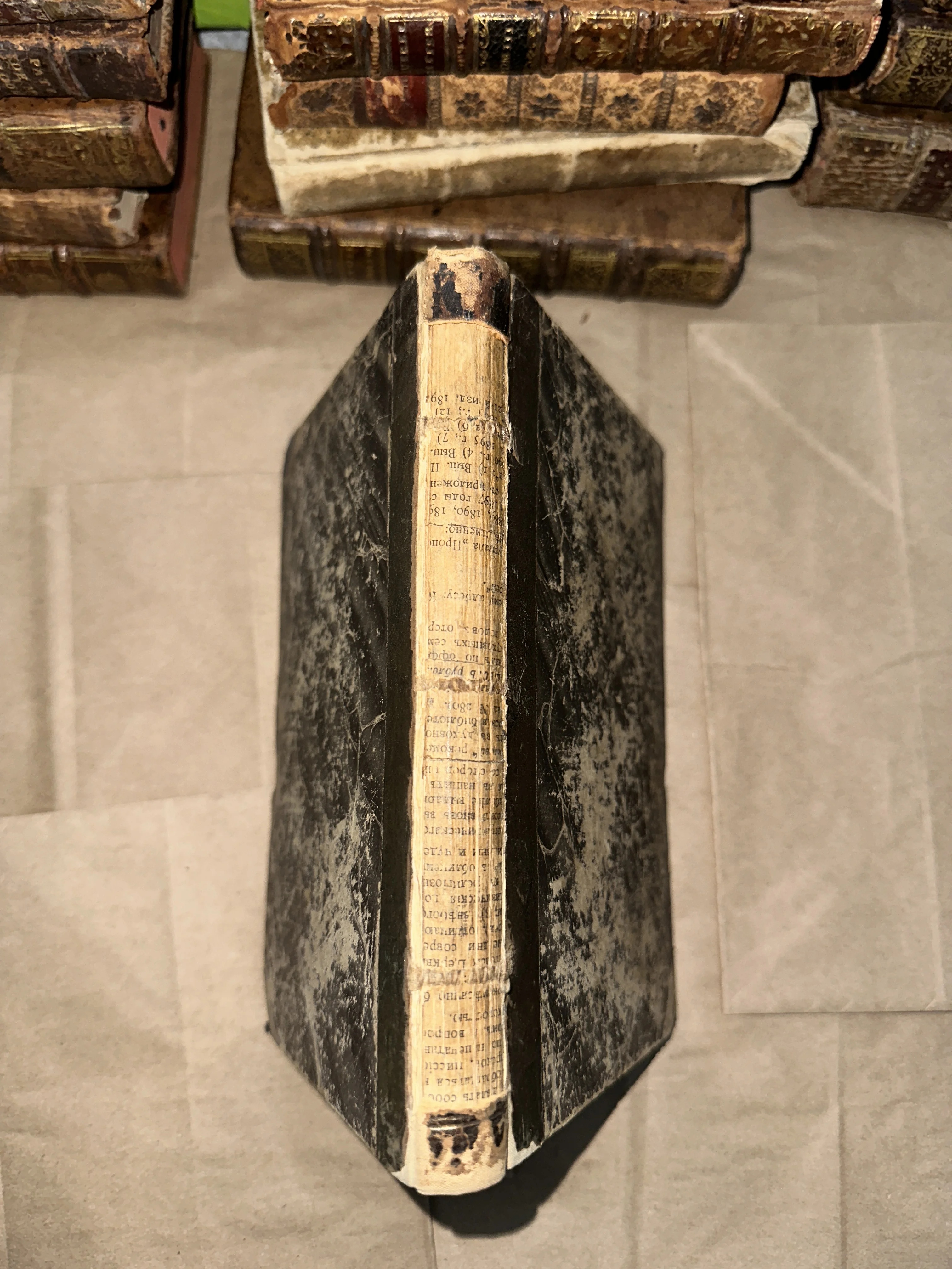 Вид сверху на корешок старинной книги с напечатанным кириллическим текстом и мраморной обложкой на фоне других антикварных фолиантов.