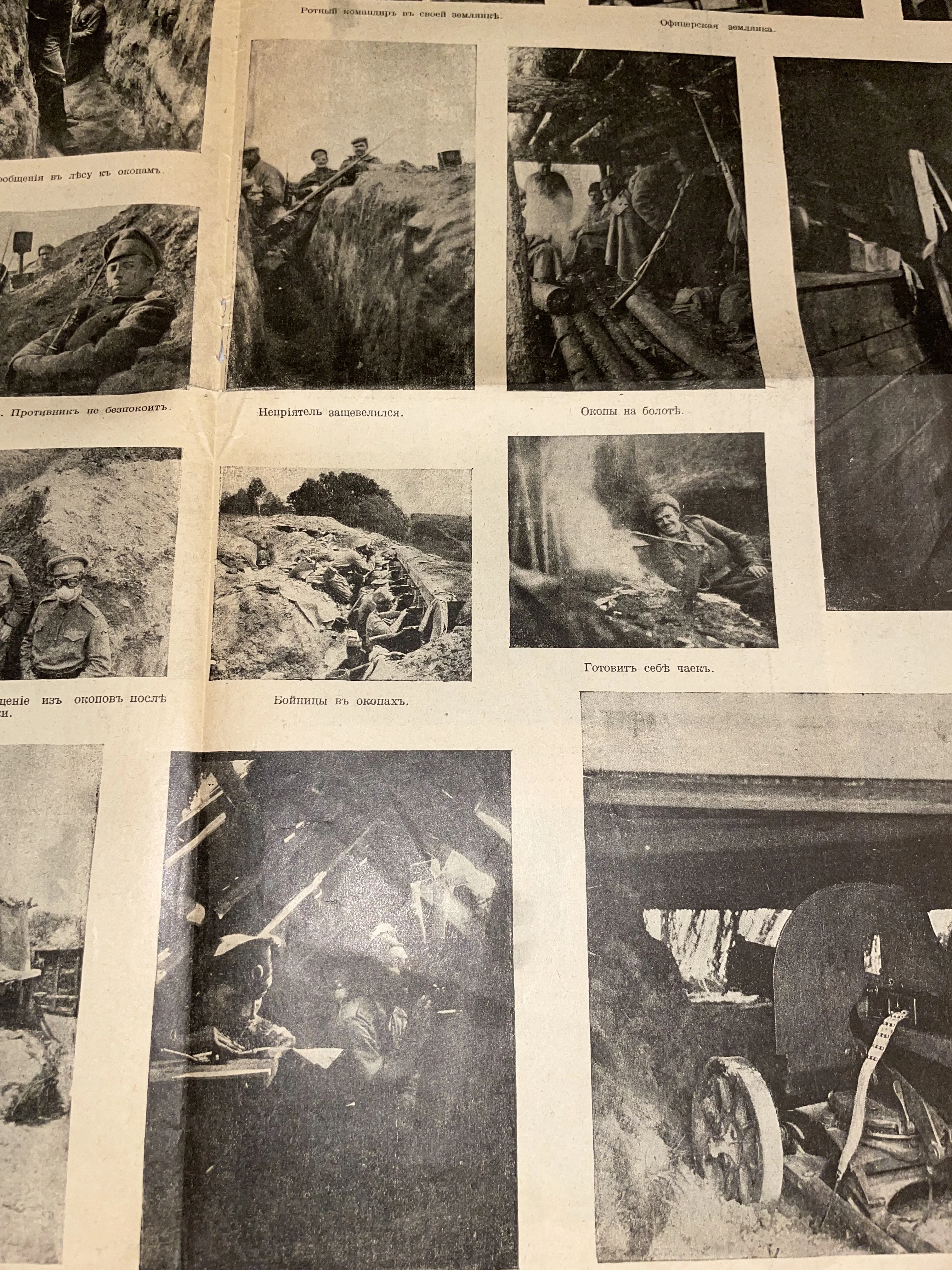 Страница старинного периодического издания с черно-белыми снимками быта русских солдат в окопах и землянках времен Первой мировой войны.