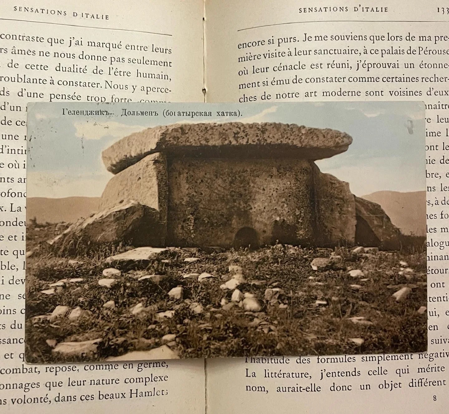 Почтовая карточка начала XX века с изображением кавказского мегалита, лежащая на страницах антикварной книги.