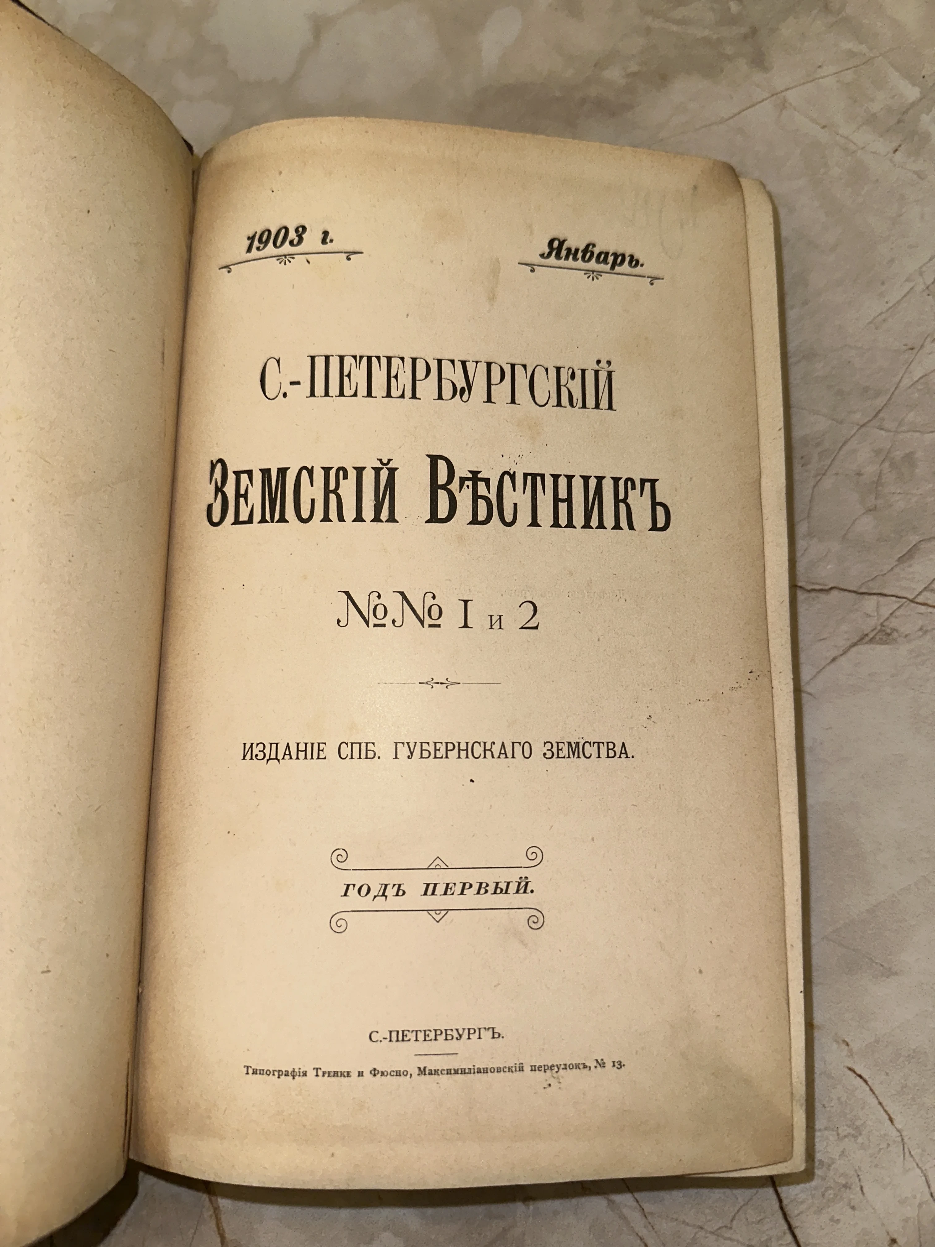Перед вами титульный лист первого года издания «С.-Петербургского земского вестника», отпечатанного в знаменитой типографии Тренке и Фюсно. Страница сохранила благородную патину времени, дореволюционную орфографию и строгую верстку начала XX века. Этот экземпляр является ценным историческим свидетельством эпохи и прекрасным дополнением к коллекции антикварной периодики.