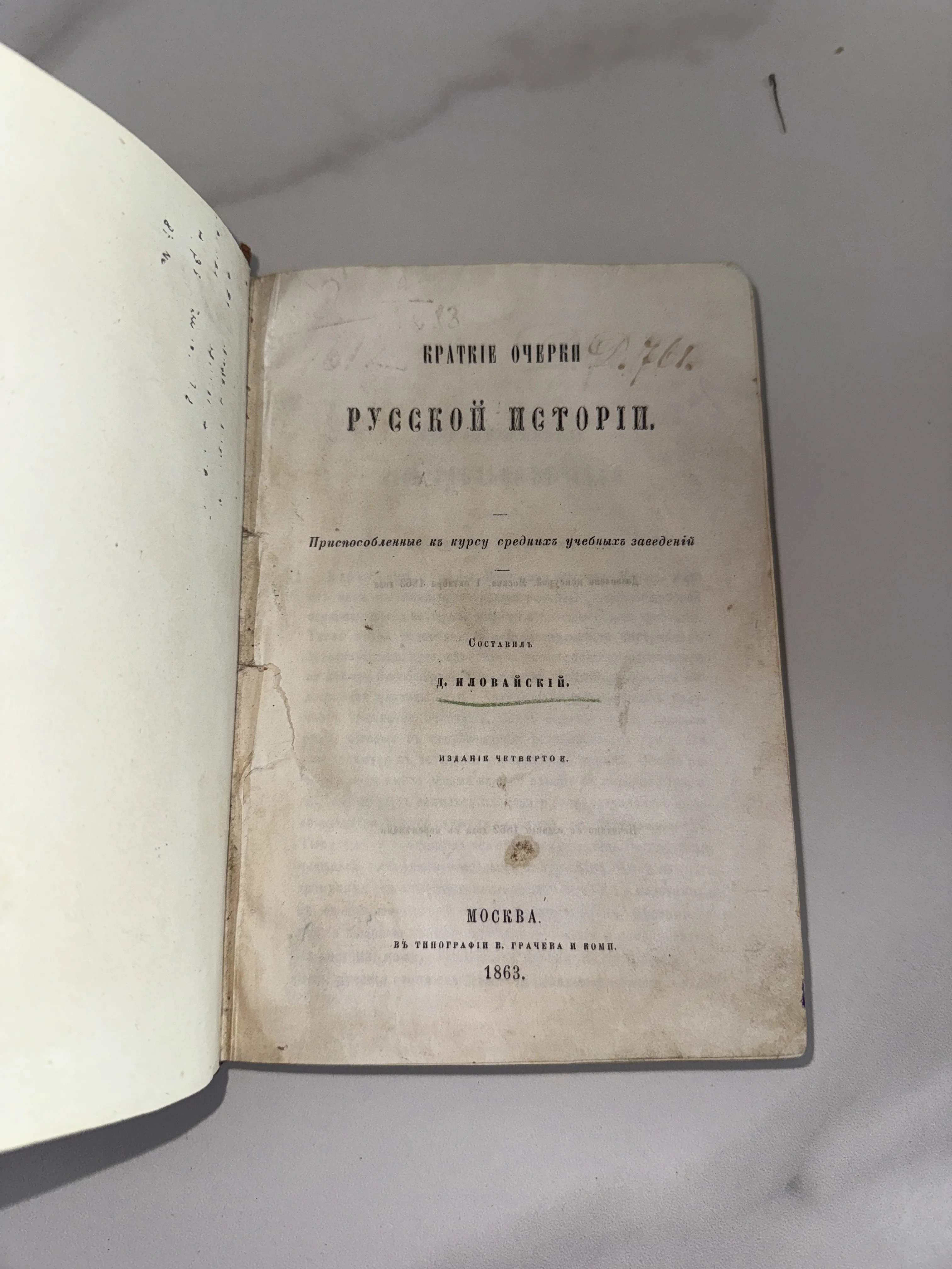 Титульный лист антикварной книги Дмитрия Иловайского «Краткие очерки русской истории», изданной в Москве в 1863 году.