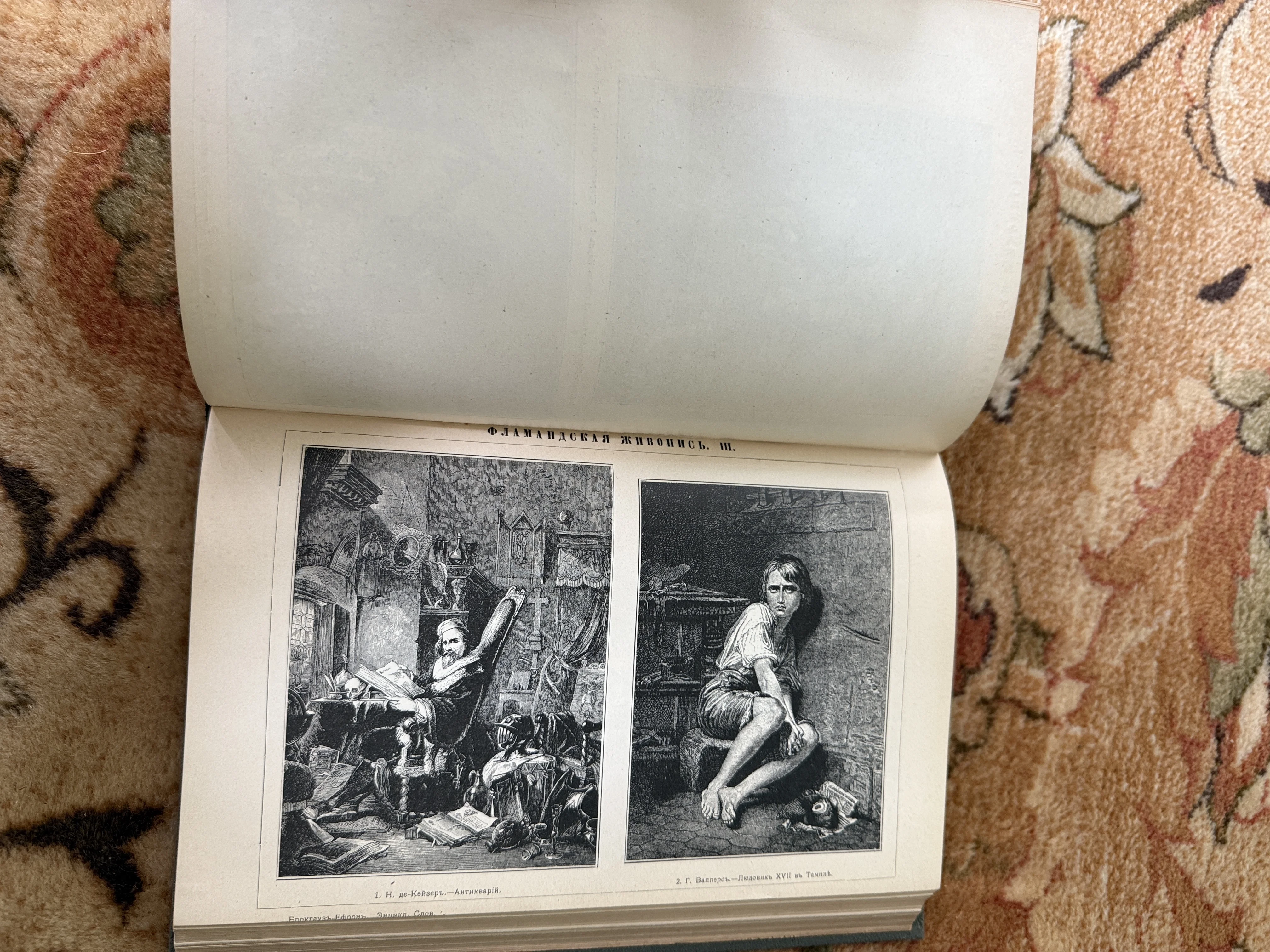 Уникальный разворот из легендарного Энциклопедического словаря Брокгауза и Ефрона, демонстрирующий высокое качество печати рубежа веков. На странице представлены детальные гравюры: уютный кабинет антиквара и драматичный портрет Людовика XVII, сохранившие четкость линий и глубину теней. Это подлинное свидетельство эпохи просвещения, которое станет украшением коллекции редких изданий или интерьера библиотеки.