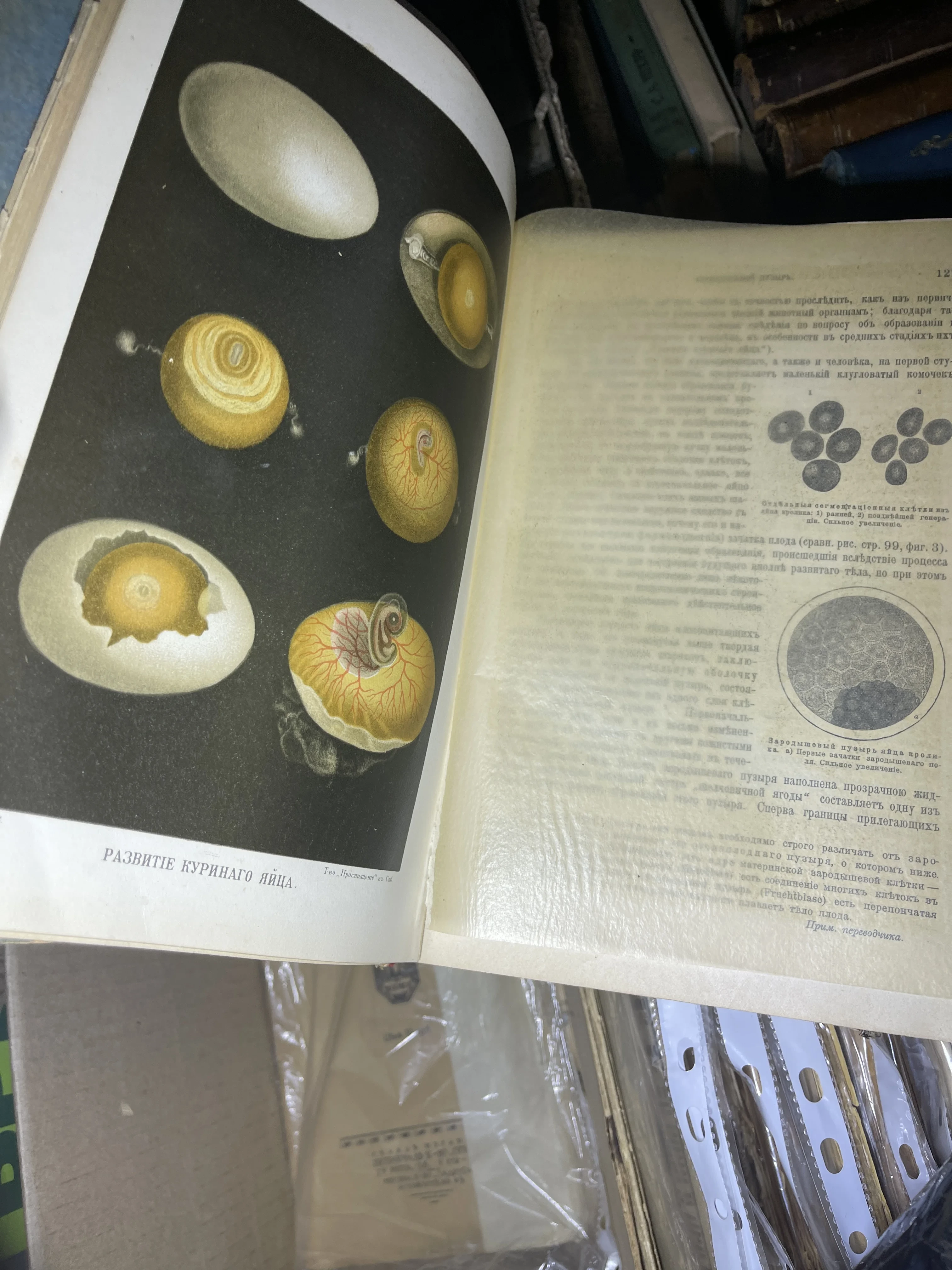 Разворот старинной научной книги с цветной литографией стадий развития куриного эмбриона и текстом на дореволюционном русском языке.