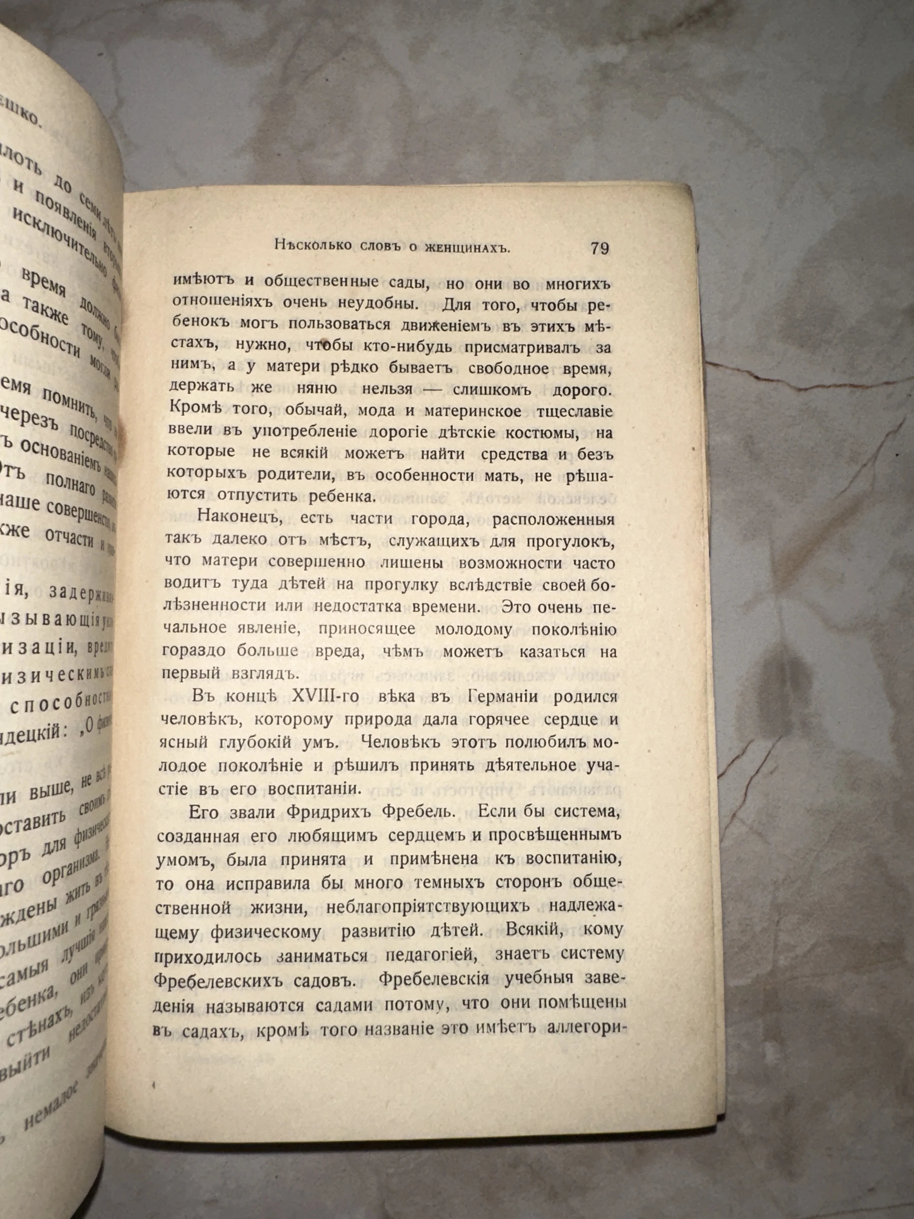 Разворот старинной книги с текстом на дореволюционном русском языке, посвященный Фридриху Фребелю и роли женщин в воспитании.